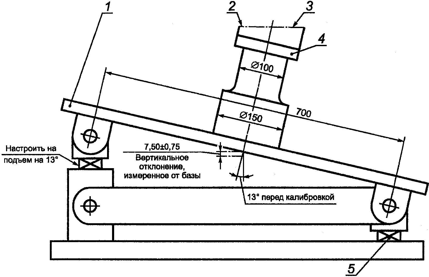 И.3.4.1. Закрепляют испытуемое колесо с шиной на стенде таким образом, чтобы ударная нагрузка приходилась на фланец обода колеса. Колесо должно быть установлено так, чтобы его ось была наклонена на угол 13° +/- 1°, а наивысшая точка находилась на центральной оси ударника.