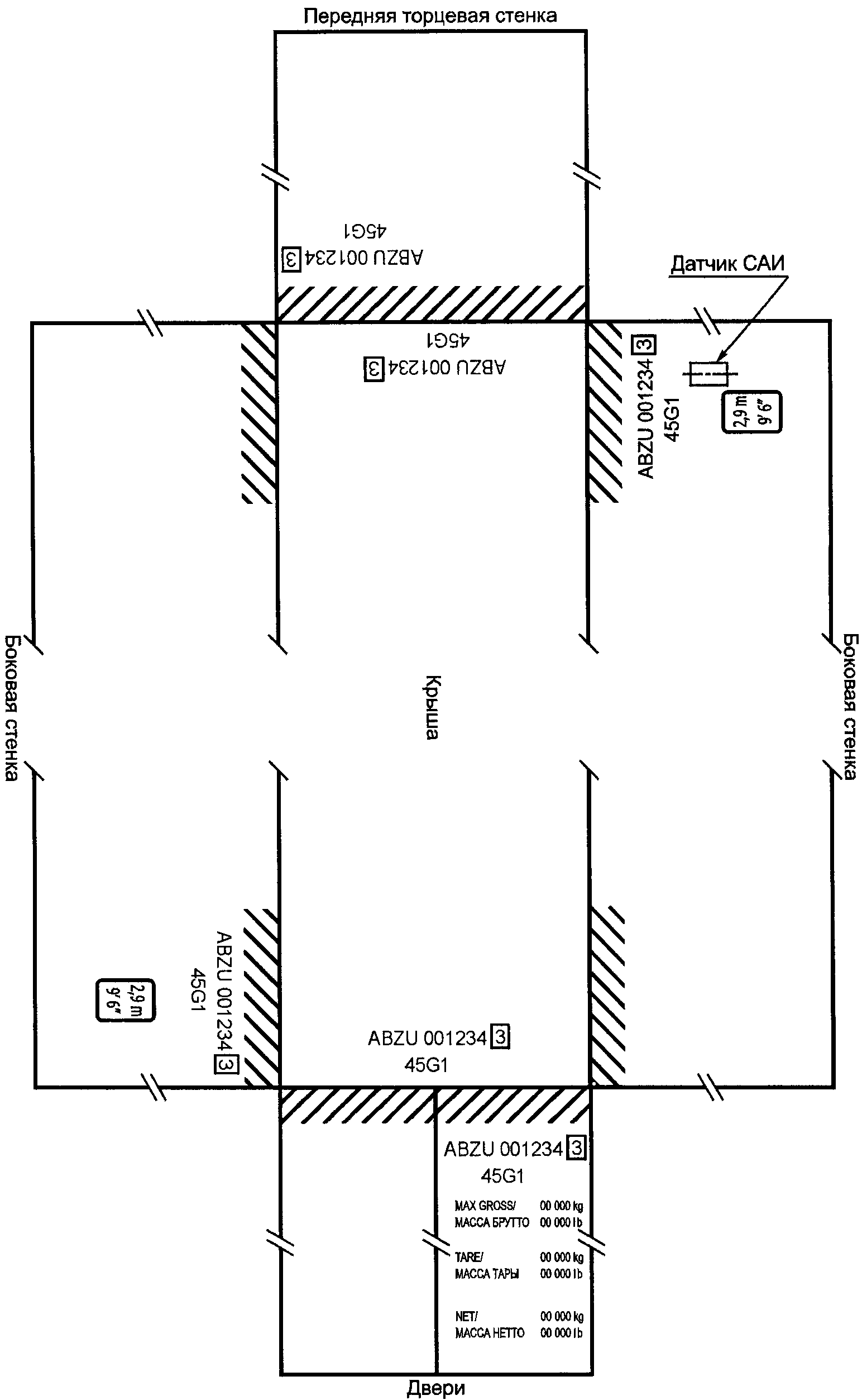 Знак располагают на каждом контейнере в двух местах: около правого края каждой стороны на расстоянии не более 1,2 м (4 фута) от крыши контейнера и в пределах 0,6 м (2 фута) от правого края ниже идентификационного номера контейнера.