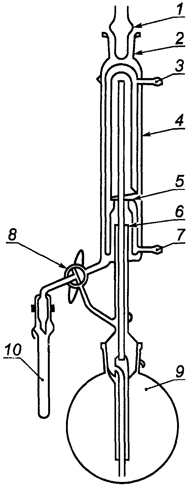 4.2.6. Установка для перегонки органических растворителей, состоящая из круглодонной колбы вместимостью 1 дм3, дефлегматора длиной 30 см и диаметром 2 см, приемной колбы вместимостью 250 см3, аллонжа и водяной бани или колбонагревателя с температурой нагрева от 40 °C до 80 °C, снабженных регулятором температуры.