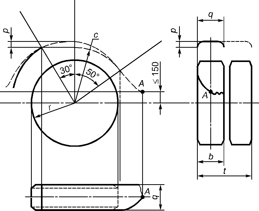 4.2.1.2 Задняя часть устройств защиты должна заканчиваться не выше горизонтальной плоскости, расположенной на расстоянии 150 мм над осью вращения колес. Пересечение кромки устройства защиты с этой плоскостью (точка А,