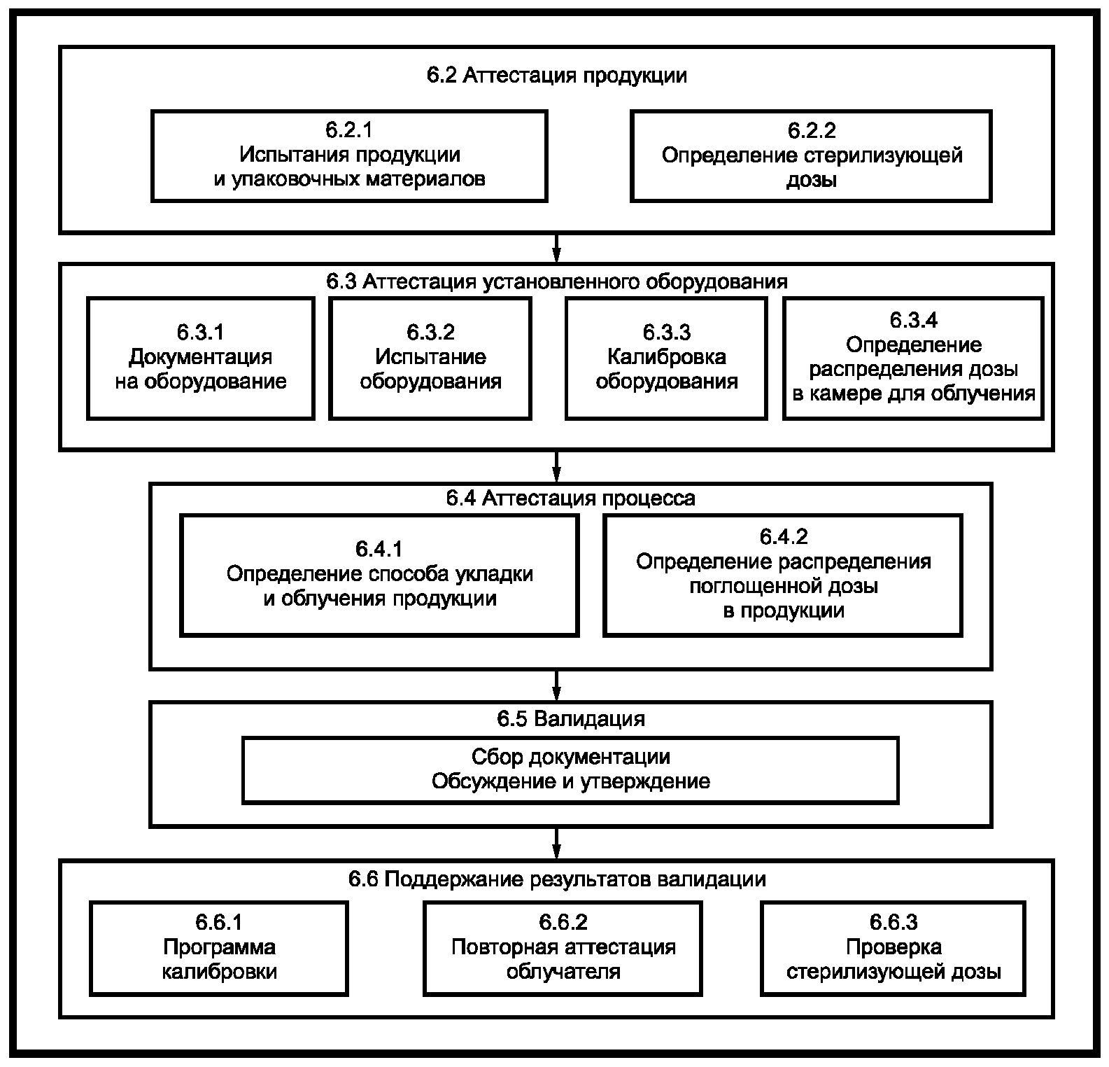 Стерилизация является примером процесса, эффективность которого не может быть проверена ретроспективным контролем и испытанием продукции. Важно понимать, что для валидированного и точно контролируемого процесса стерилизации облучение не является единственным условием гарантии того, что изделие стерильно и пригодно для использования по назначению. Следует уделять внимание микробиологическому состоянию сырья и/или комплектующих, микробиологическим защитным свойствам упаковки и контролю внешних условий изготовления, сборки, упаковки и хранения продукции.