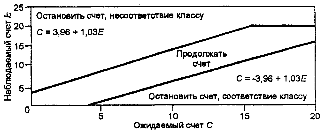 (рисунок F.1). Если полный наблюдаемый счет пересекает верхнюю линию, отбор пробы в данной точке останавливают и регистрируют факт, что воздух не соответствует заданному классу. Если полный наблюдаемый счет пересекает нижнюю линию, пробоотбор останавливают и регистрируют факт, что воздух соответствует заданному классу. Если полный наблюдаемый счет остается между верхней и нижней линиями, то пробоотбор продолжают.