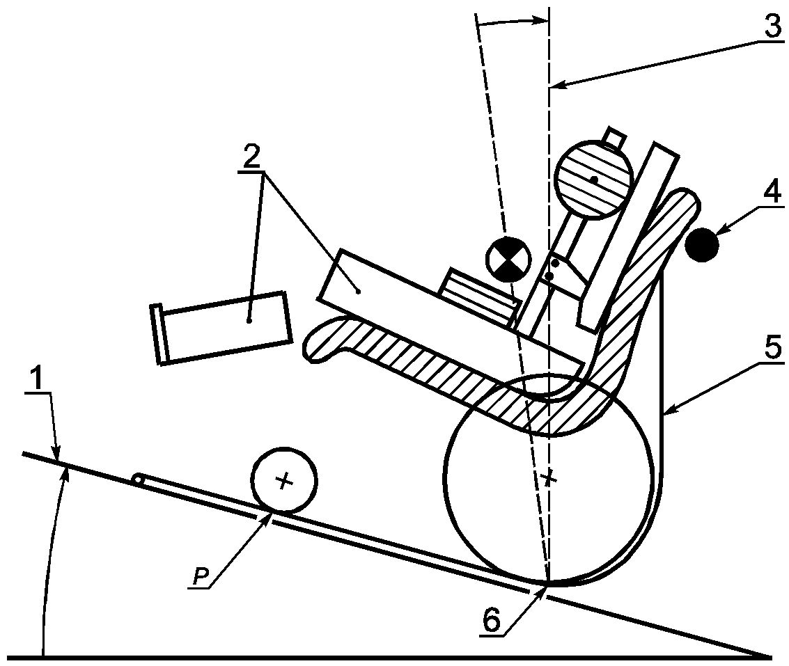 3.2. предельный угол наклона: Угол наклона испытательной плоскости, при котором сила давления колес кресла-коляски, находящихся вверху на плоскости, становится равной нулю.