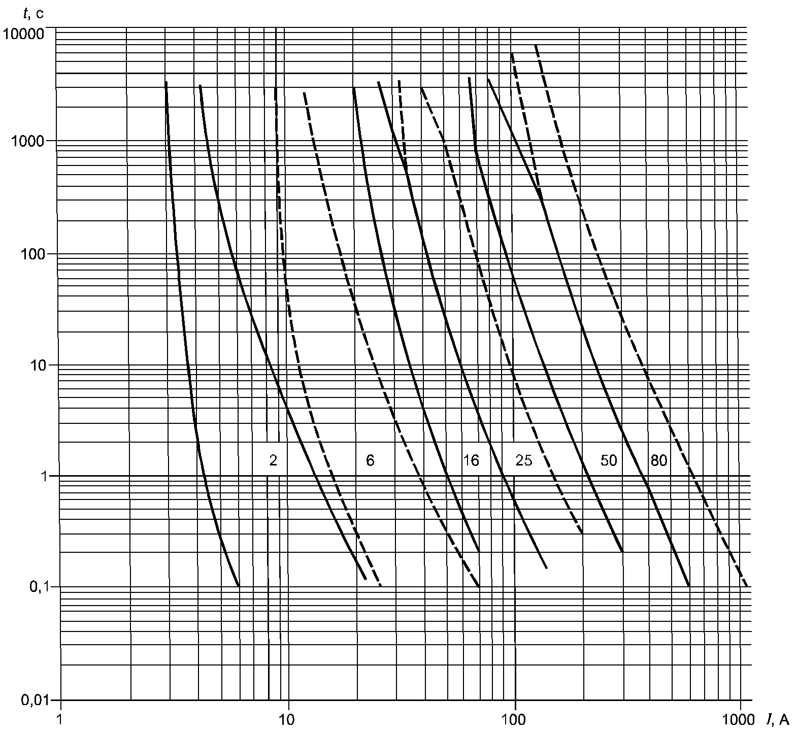 Рисунок А.1. Время-токовые зоны для плавкого предохранителя