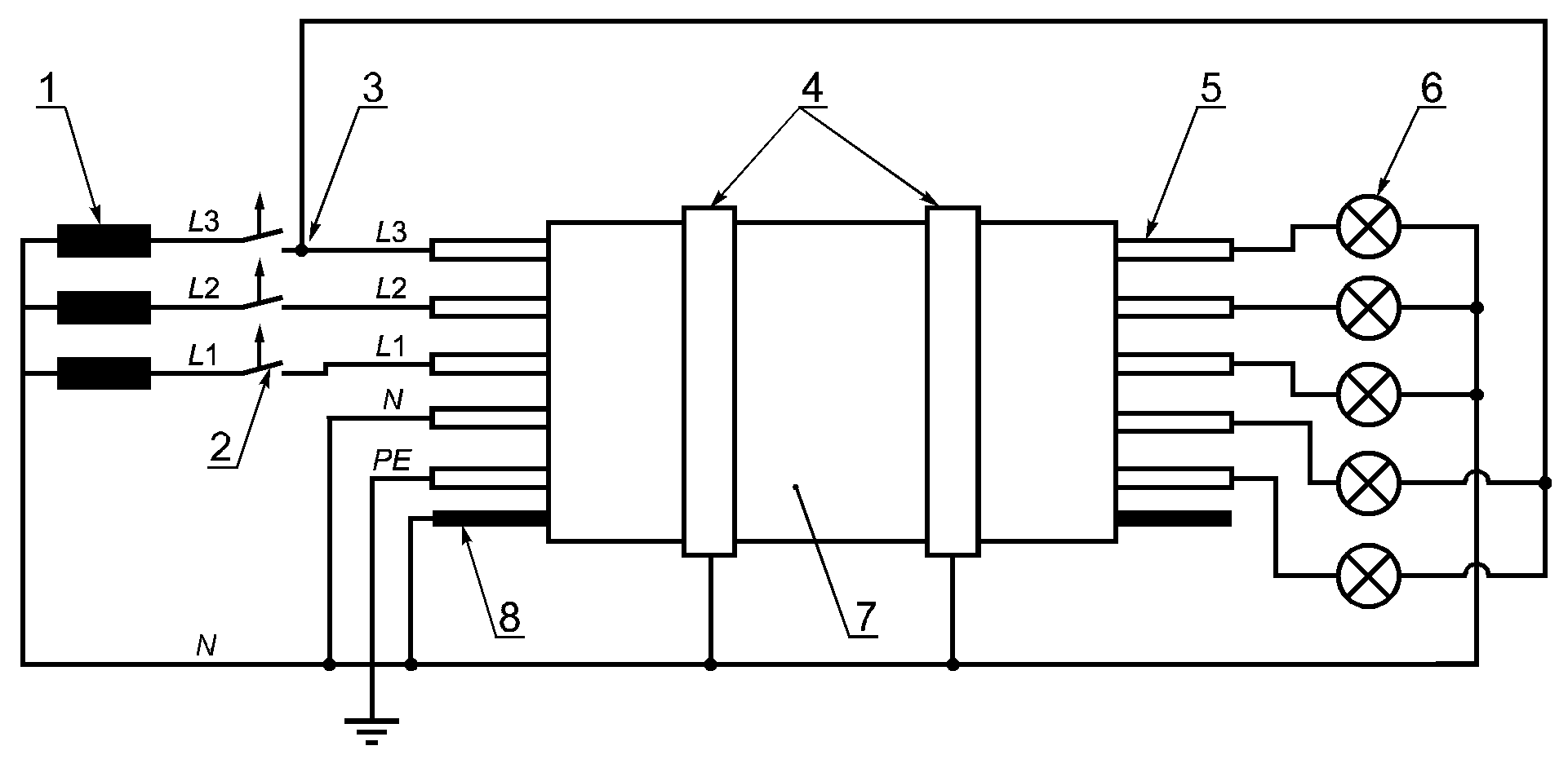 1 - трансформатор; 2 - плавкий предохранитель (2A); 3 - подсоединение к фазе (или L1, или L2); 4 - поддерживающие кольца; 5 - испытуемая жила или группа жил; 6 - нагрузочный индикаторный прибор (например, лампа); 7 - образец; 8 - металлический экран (если имеется); L1, L2, L3 - фазные жилы (L2, L3, если имеются); N - нейтральная жила (если имеется); PE - защитная жила (если имеется)
