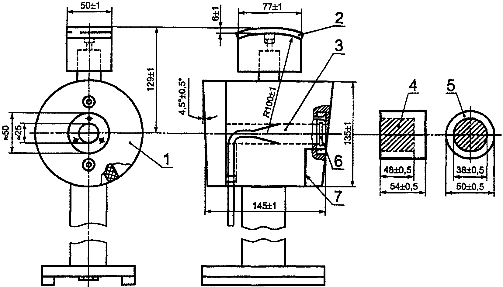 4.1.2 Опорная накладка должна выступать из центра цилиндра по длине под прямым углом к центральной оси этого цилиндра для поддерживания оголовья звукоизолирующих наушников во время испытания. Длина накладки по центральной оси цилиндра - (123 +/- 1) мм. Радиус свободного конца этой накладки - (100 +/- 1) мм. К этому концу накладки должен быть подсоединен резиновый буртик толщиной (6 +/- 1) мм для упругой посадки звукоизолирующих наушников на оголовье. Ширина свободного торца резинового буртика - (50 +/- 1) мм, длина - (77 +/- 1) мм.