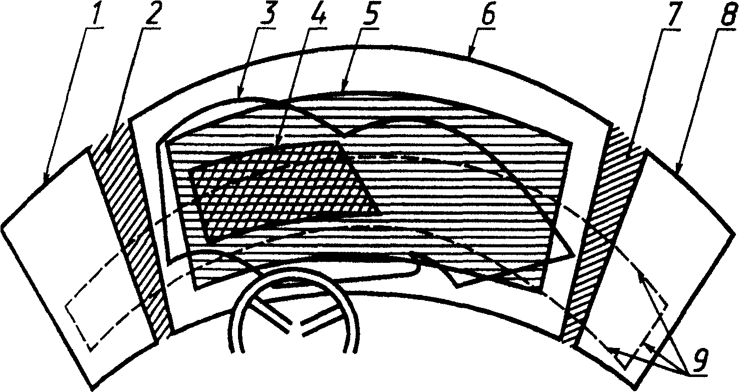 нормативной зоны Б; 6 - граница прозрачной части переднего