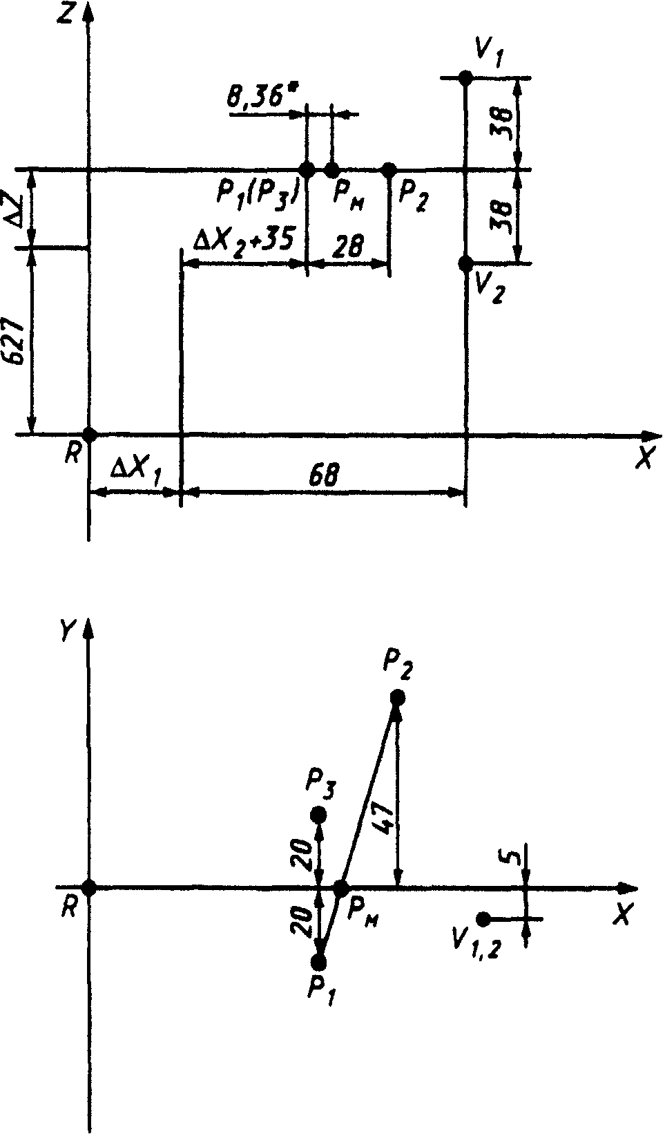 Точки P - характеристические точки пересечения оси поворота головы сидящего в направлении к объекту наблюдения с горизонтальной плоскостью, расположенной на высоте глаз, принятые для определения углов непросматриваемых зон, образуемых стойками переднего окна. При этом имеется в виду, что сидящий поворачивает голову вокруг вертикальной оси. Координаты точек P через угол наклона туловища сидящего и продольную регулировку сиденья для нормального управления или использования зависимы от координат точки R.