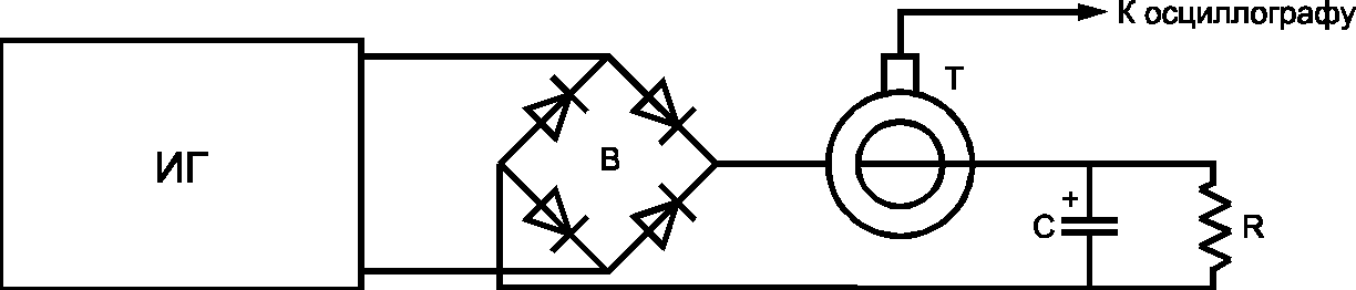рисунке В.1. Использование выпрямительного моста делает необязательным изменение полярности выпрямителя для испытаний при базовом угле 270 град по сравнению с 90 град. Значение тока в проводах электропитания мостового выпрямителя должно быть по крайней мере вдвое больше нагрузочной способности ИГ по пиковому току, чтобы обеспечить соответствующий запас надежности функционирования.