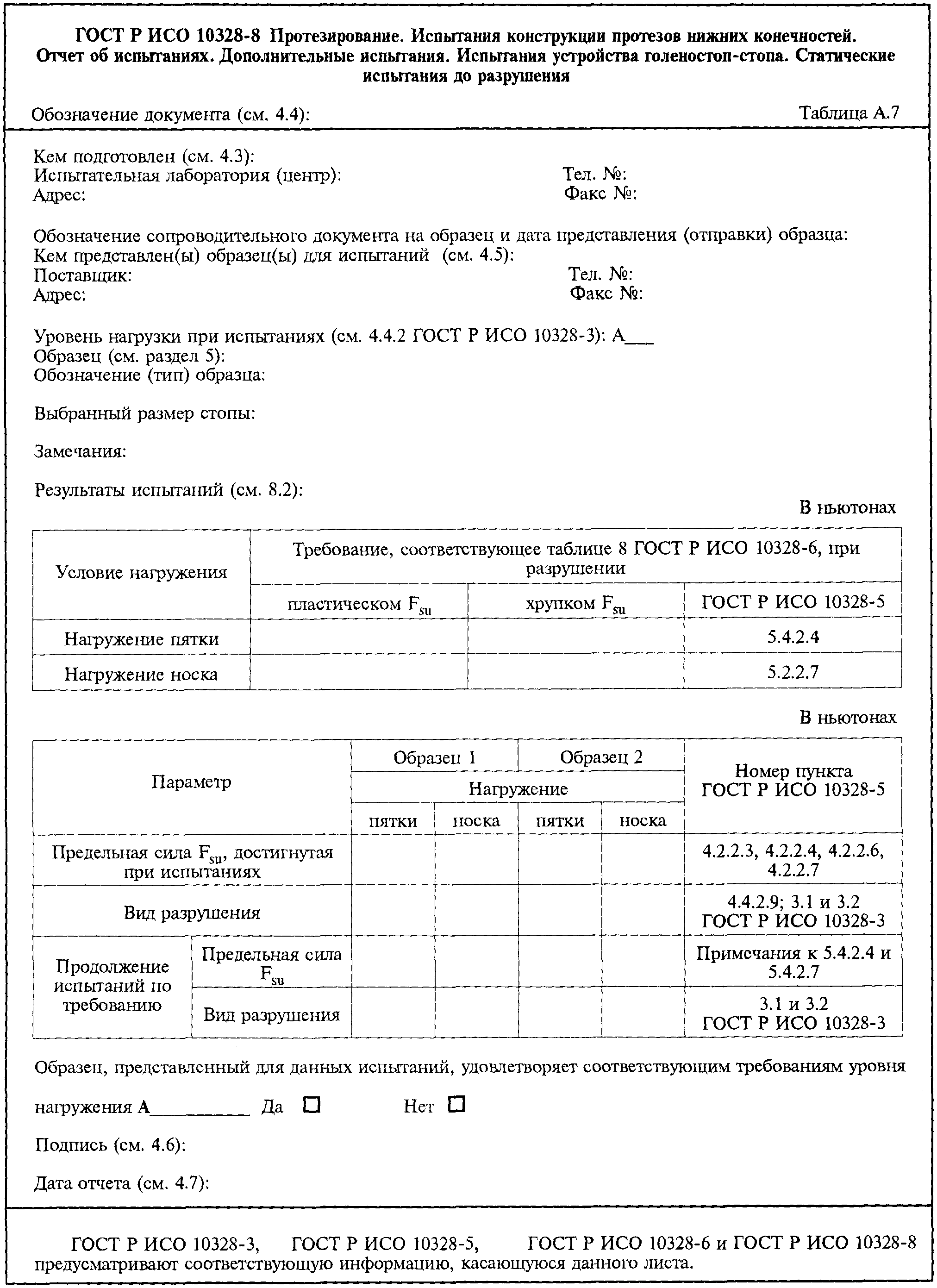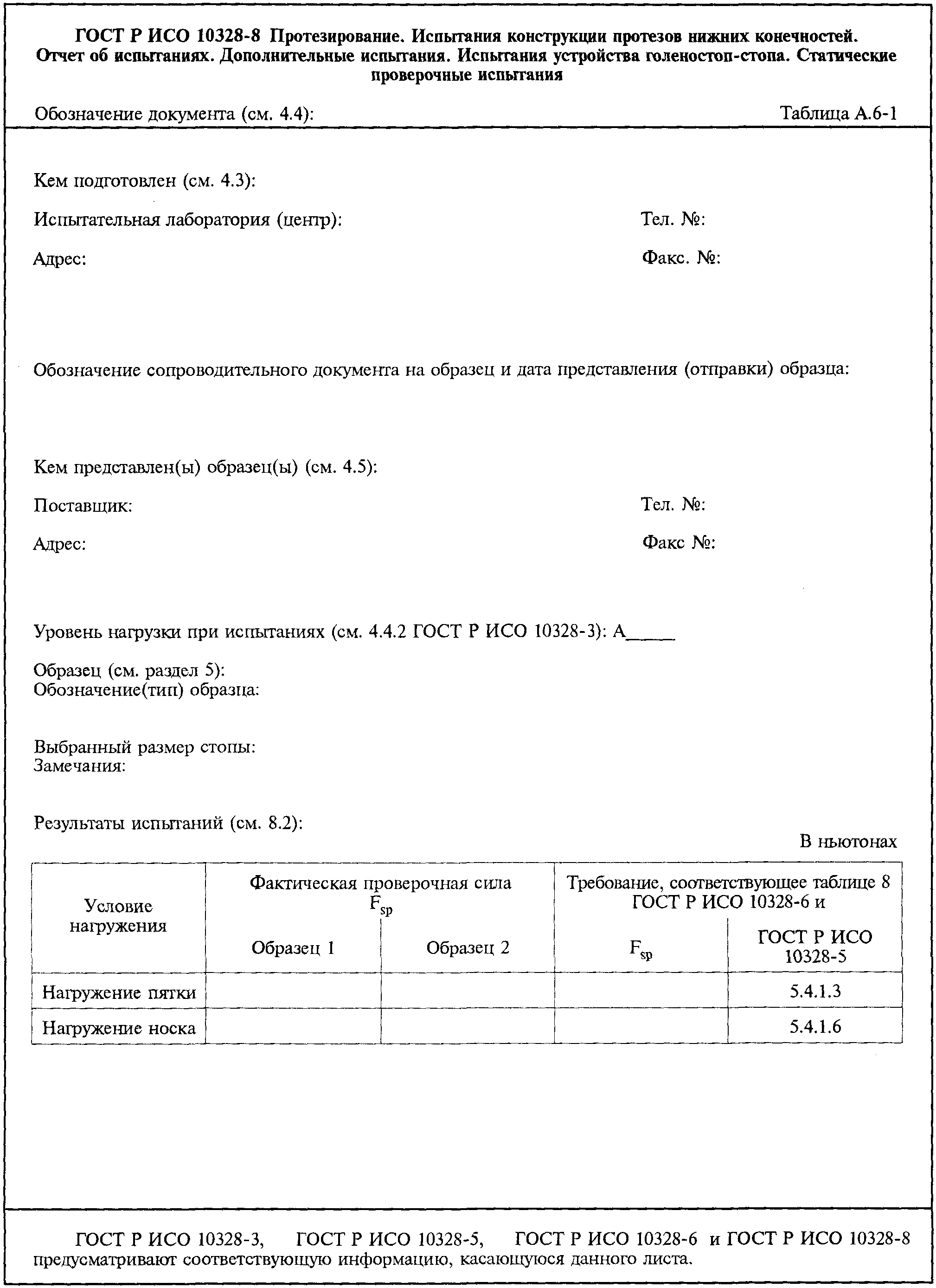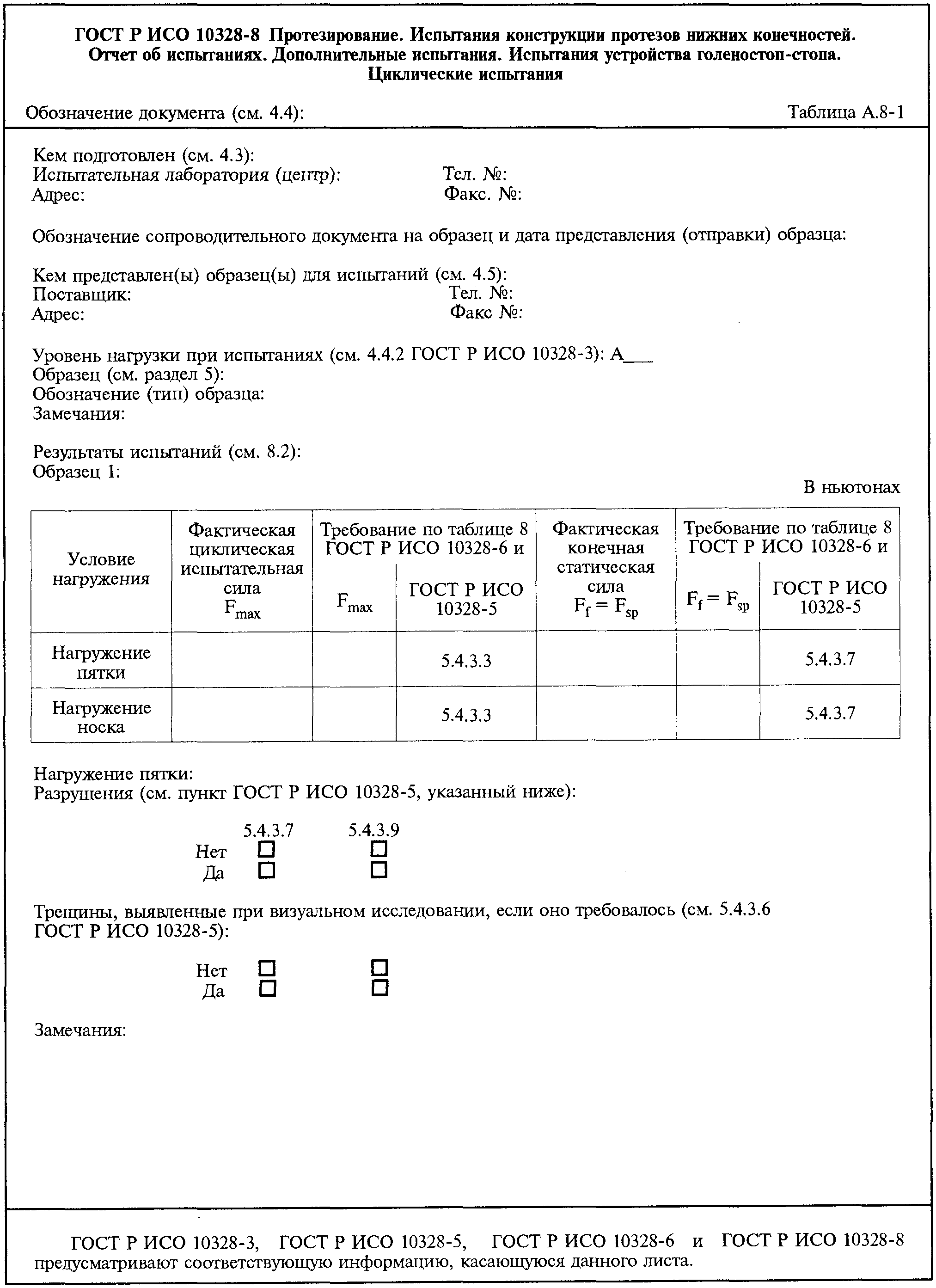 "ГОСТ Р ИСО 10328-8-98. Государственный стандарт Российской Федерации. Протезирование. Испытания конструкции протезов нижних конечностей. Часть 8. Отчет об испытаниях"