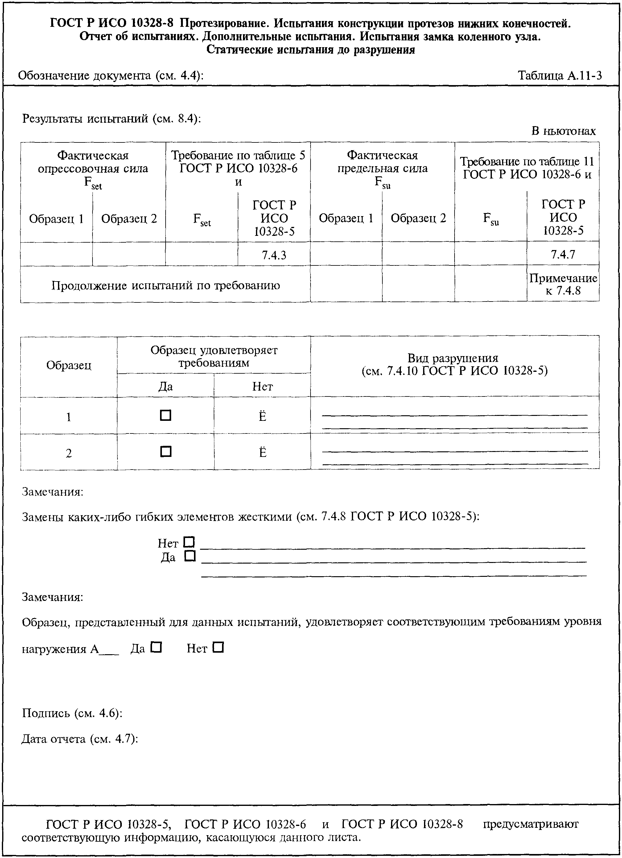 5.2 Для образцов, подлежащих статическим испытаниям до разрушения и циклическим испытаниям, в отчет должны быть включены данные о всех заменах гибких элементов жесткими по
