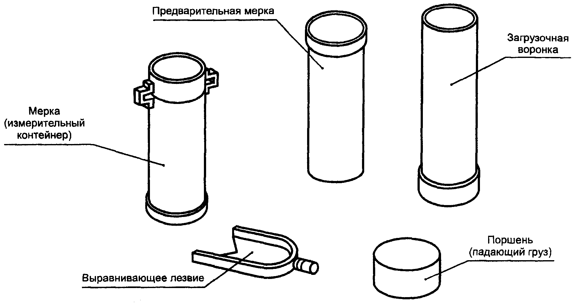 Для того, чтобы свести к минимуму такие случайные отклонения и ошибки, необходимо строго контролировать геометрические размеры составных частей пурки и способ засыпки зерна. Поэтому используемые составные части пурки (рисунок 1) и метод проведения испытаний должны отвечать требованиям, изложенным в настоящем разделе и в