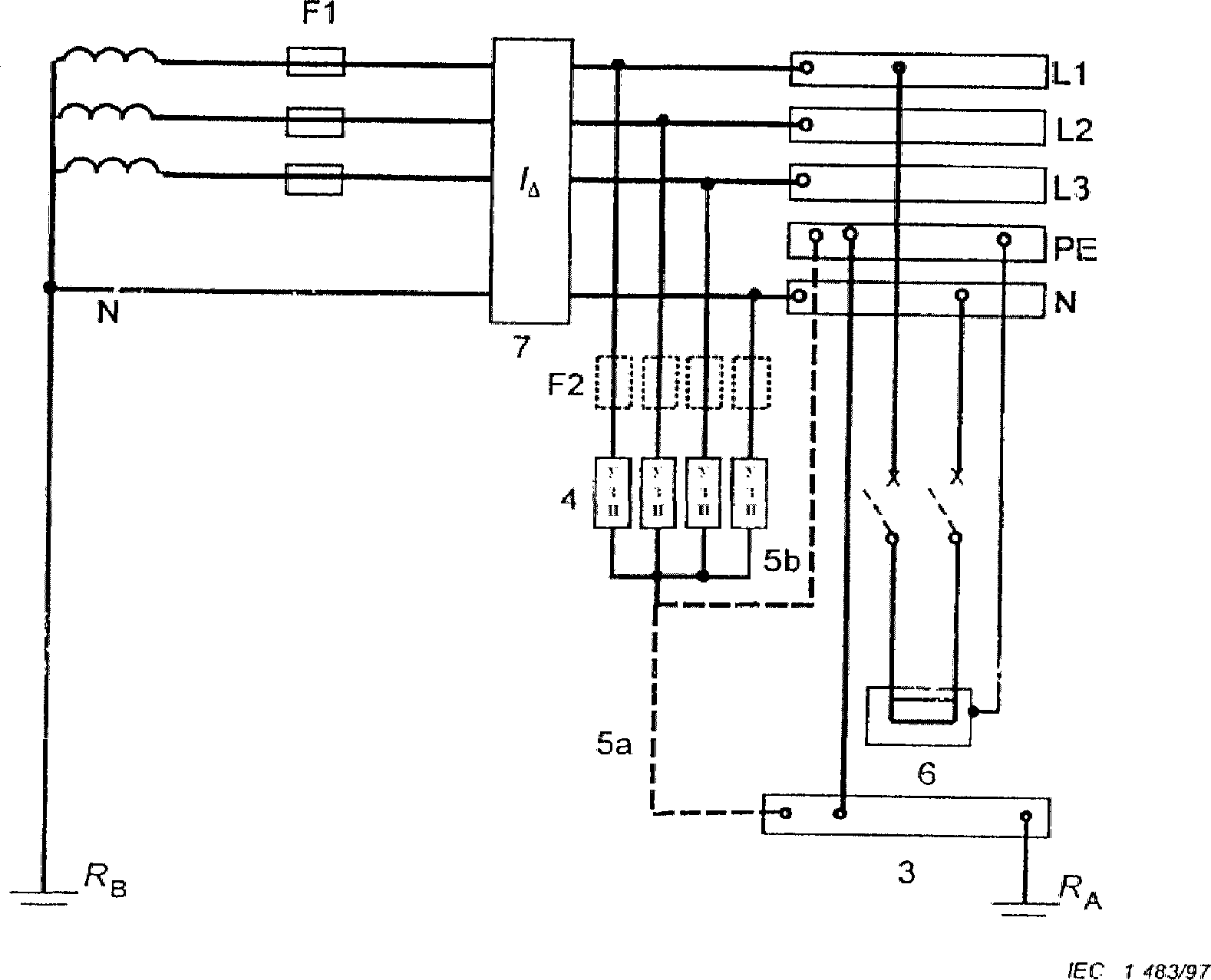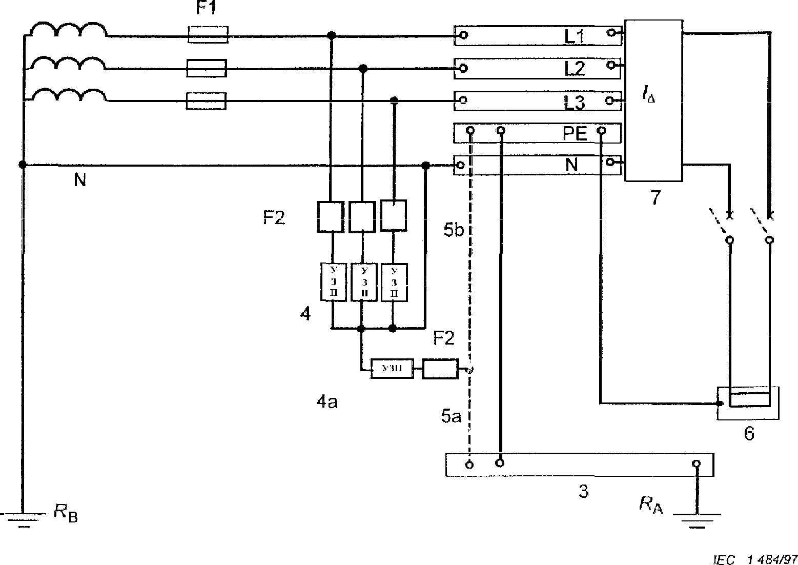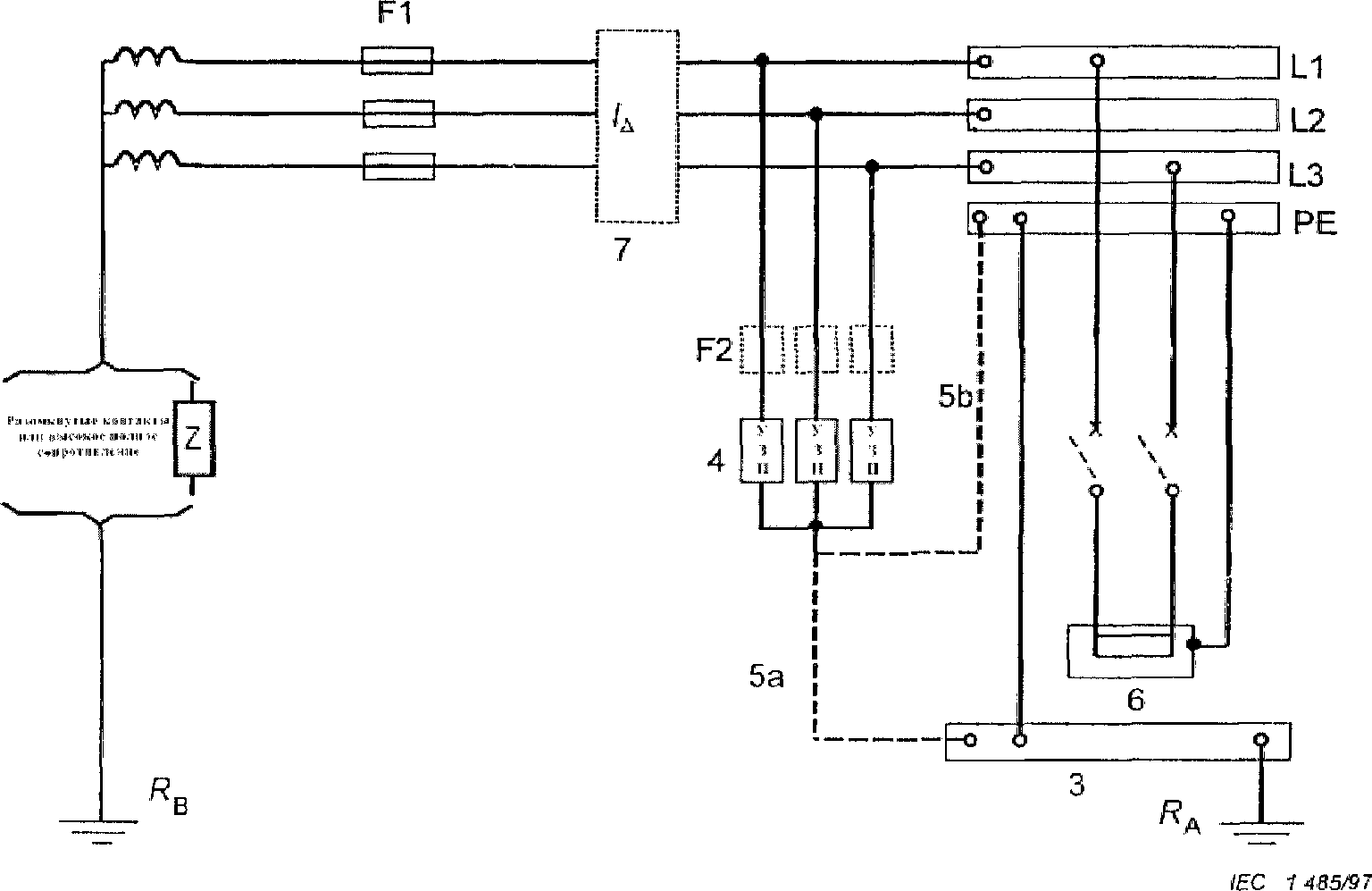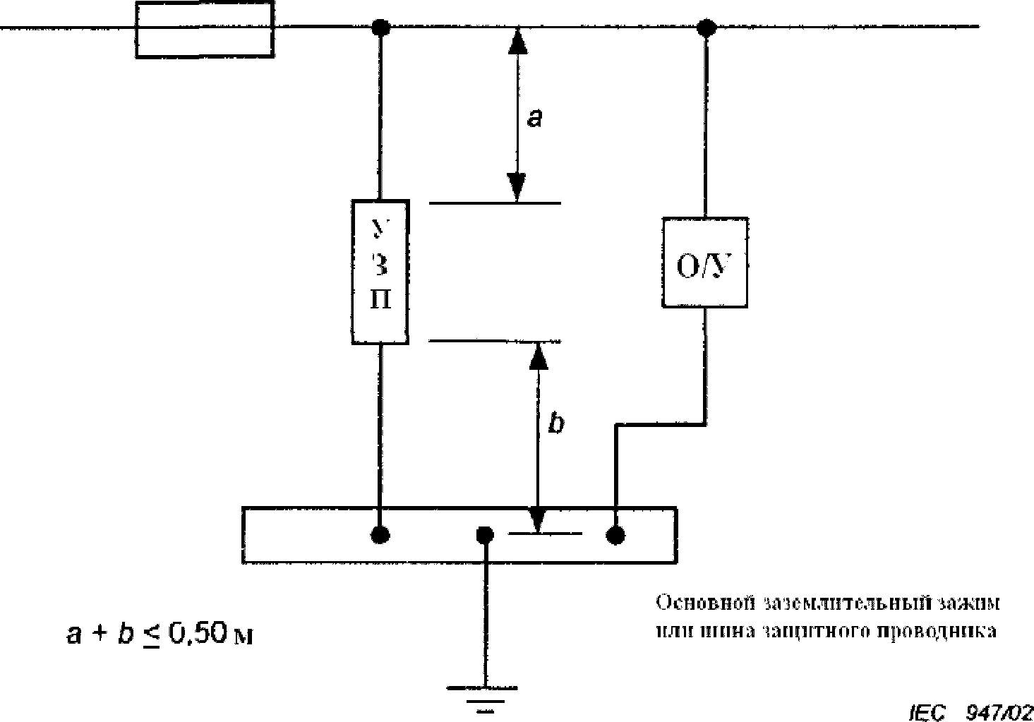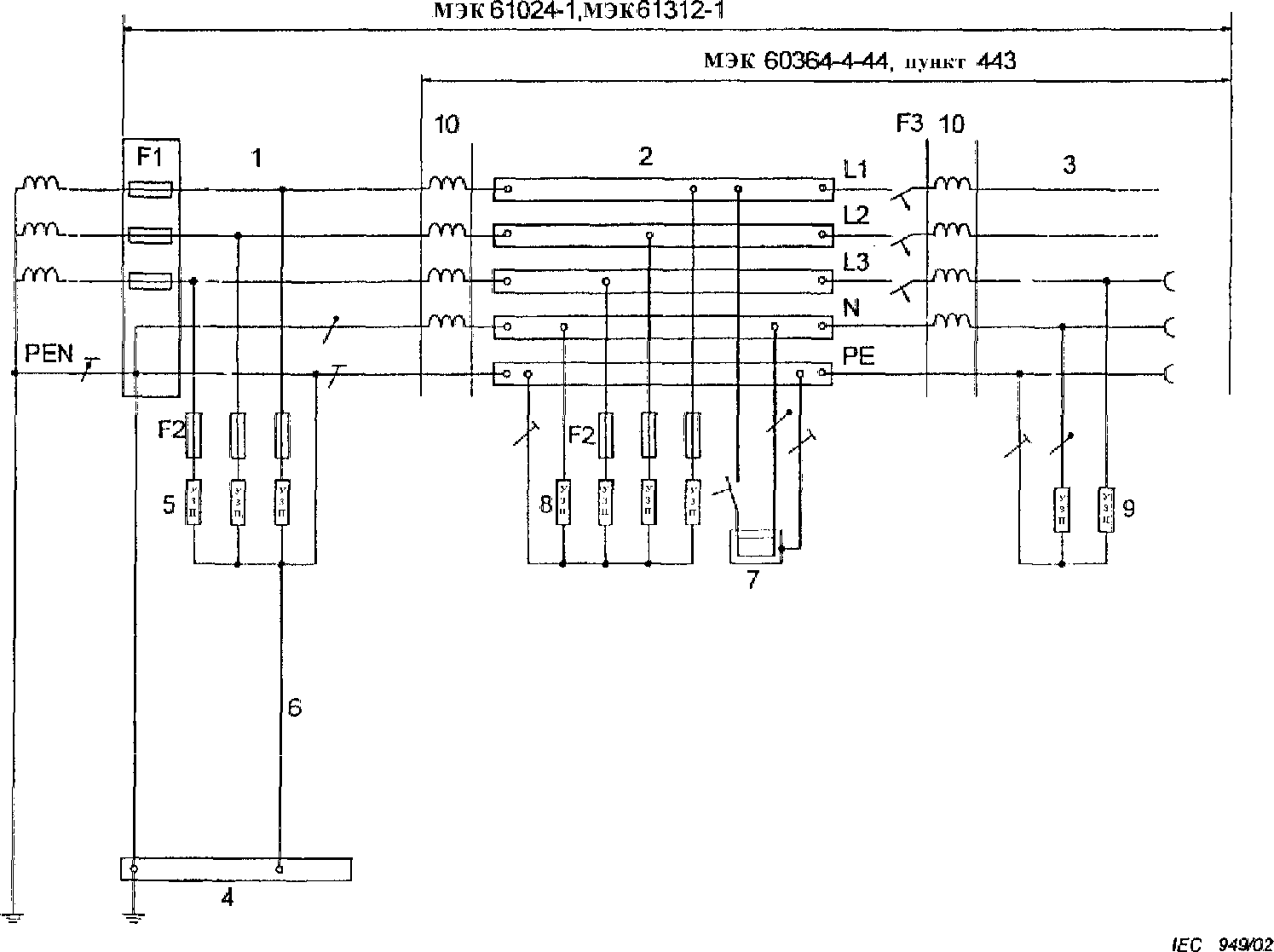 3 | Зажим или шина основного заземления | F1 | Защитное устройство на входе электроустановки |