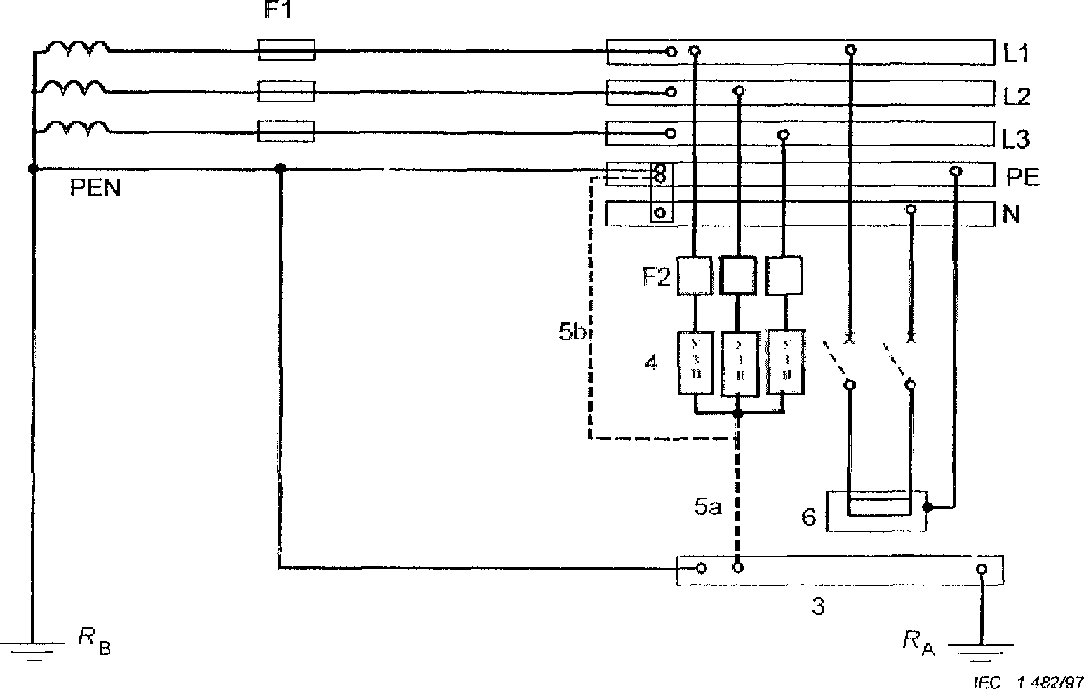 5 | Заземляющее соединение устройств защиты от перенапряжений, 5a и/или 5b | RA | Заземляющий электрод (заземляющее сопротивление) электроустановки |