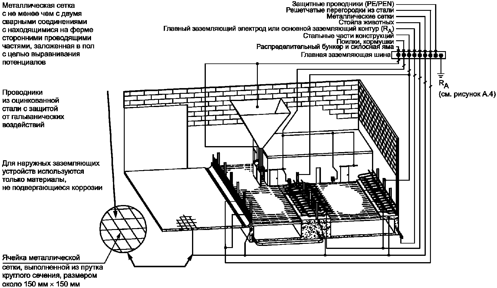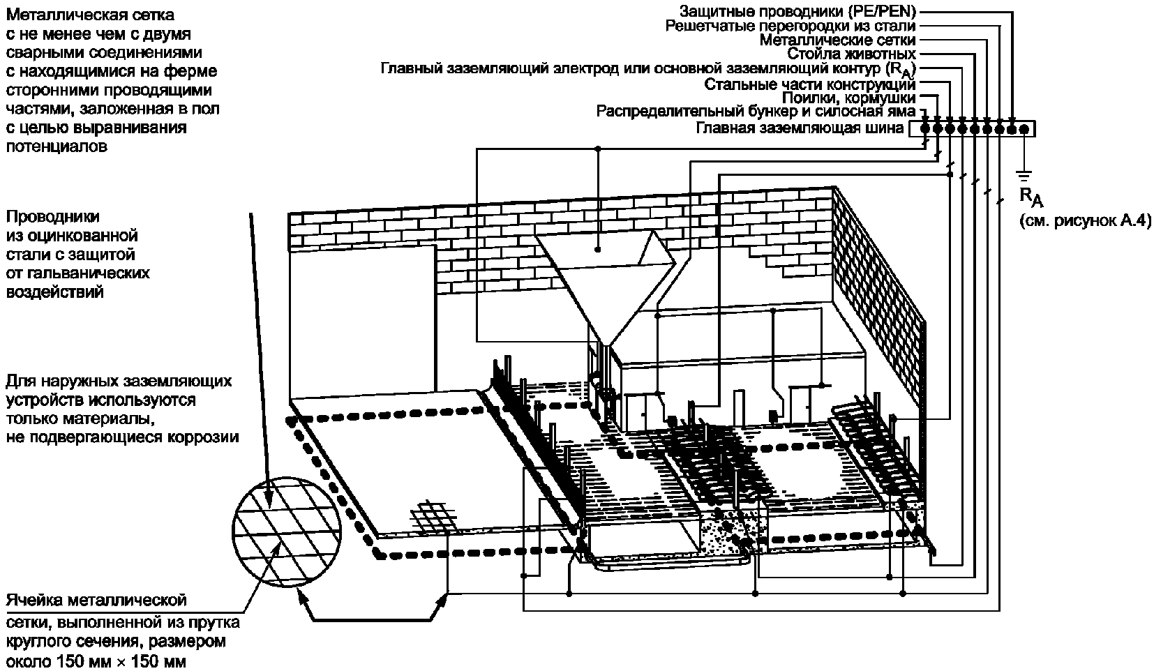 Приложении A настоящего стандарта, защита от поражения электрическим током сельскохозяйственных животных и меры для устранения их электропатологии могут быть выполнены применением специальных устройств выравнивания электрических потенциалов (УВЭП) в соответствии с требованиями