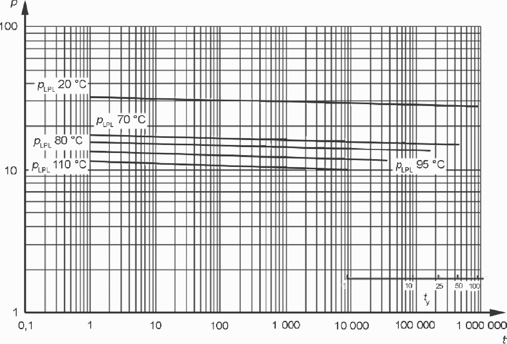 3.14 длительное гидростатическое давление pLTHS: Значение с размерностью давления, представляющее собой прогнозируемое среднее давление при температуре T и времени t (50%-ный доверительный предел).
