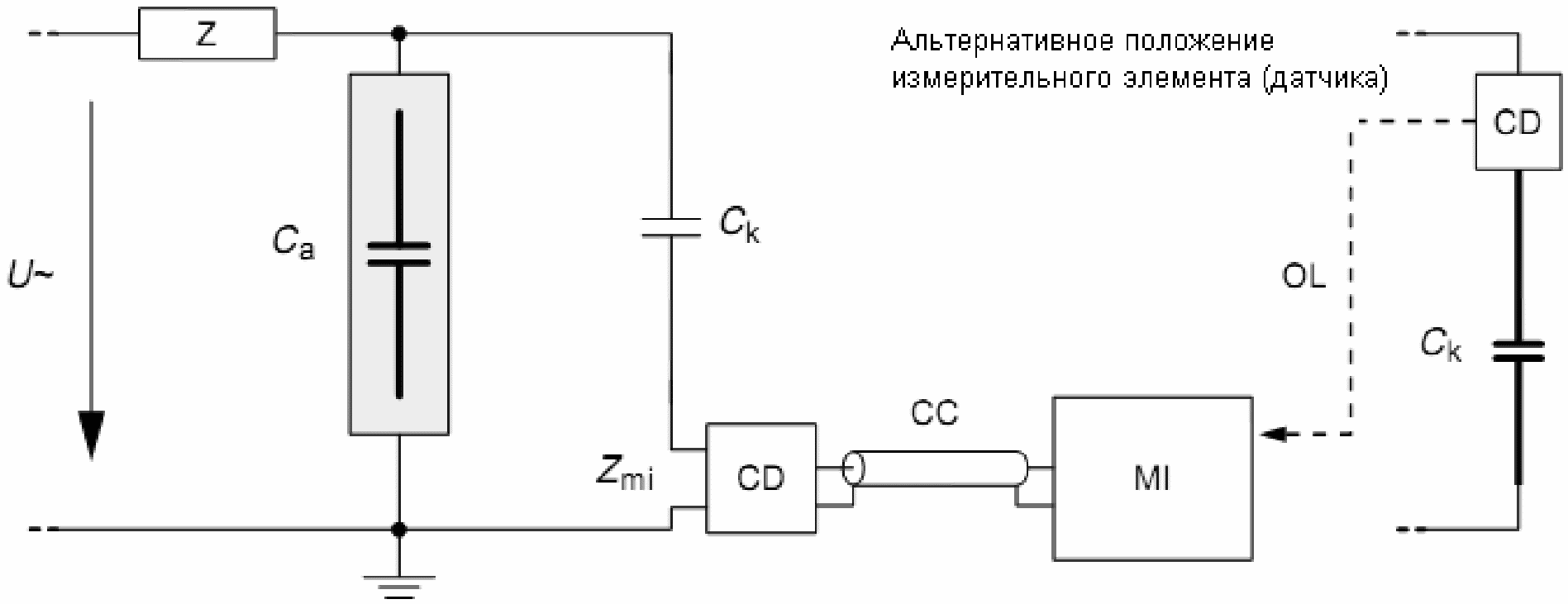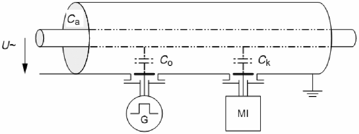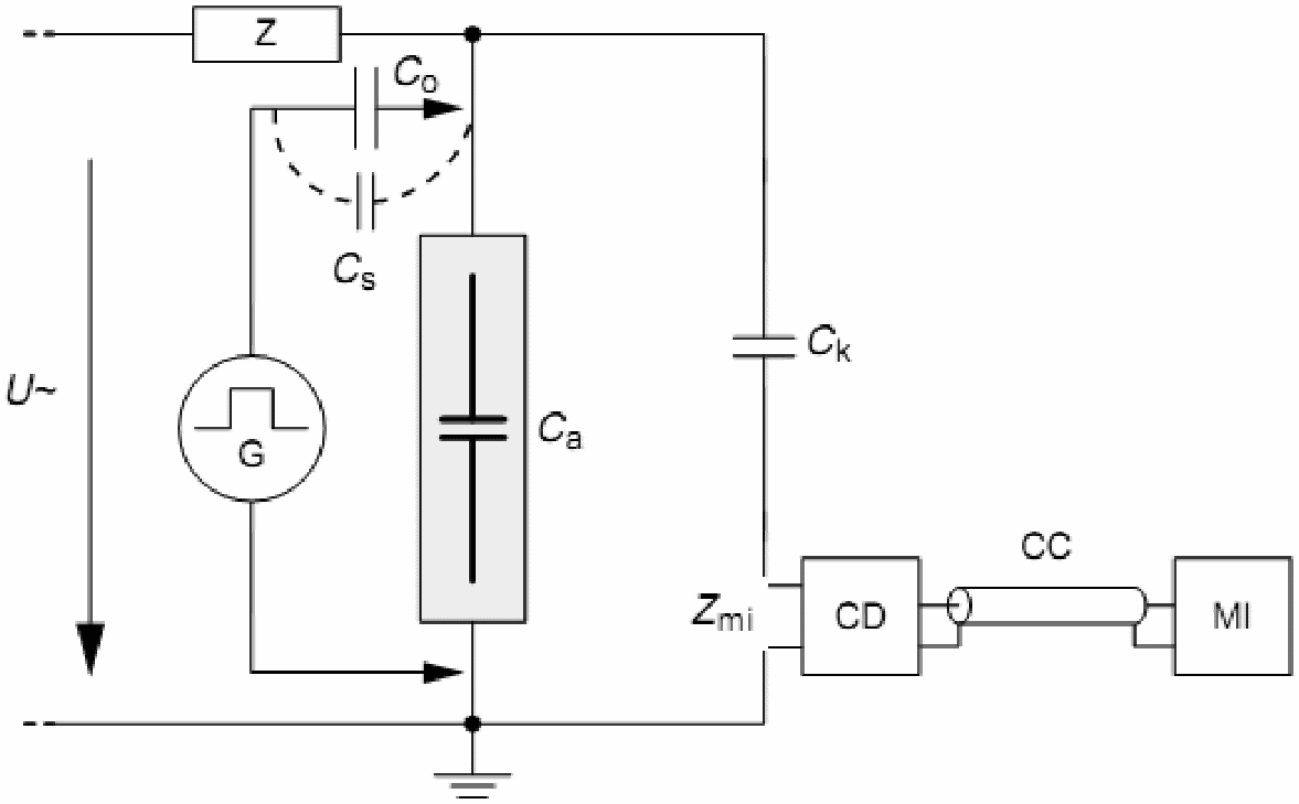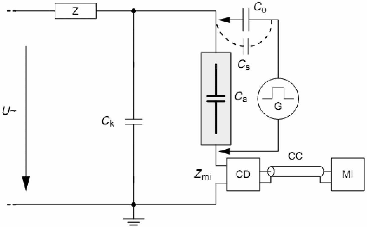 Поскольку электромагнитные наведенные помехи в контуре, образуемом Ca и Ck, нельзя отличить от частичных разрядов, то должны быть применены дополнительные средства.