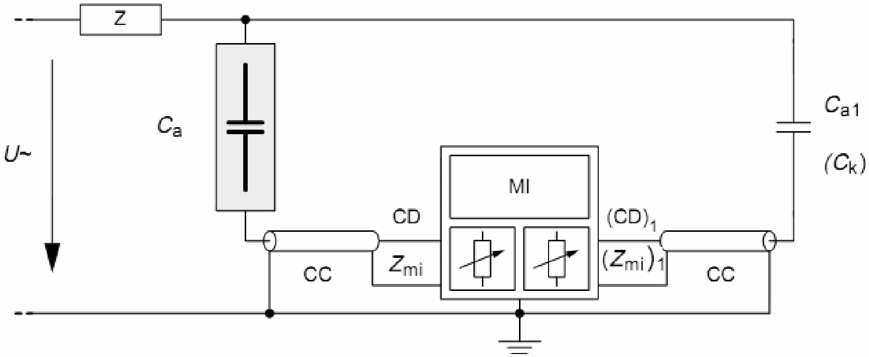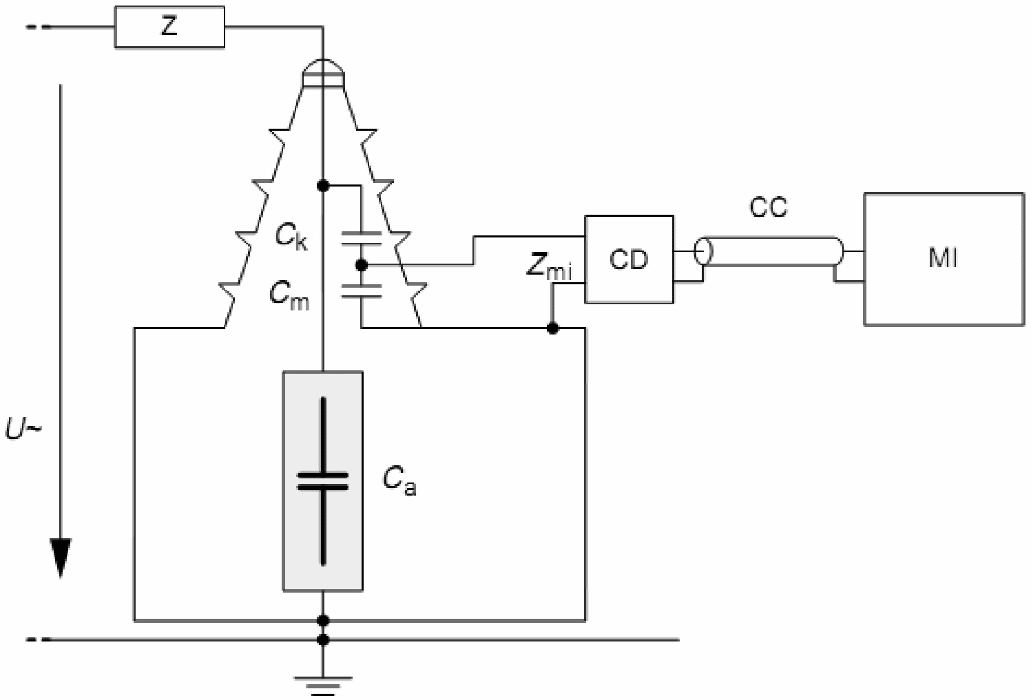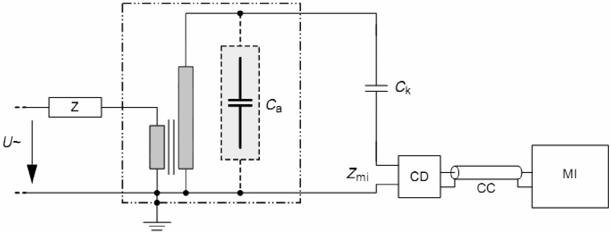 Поскольку электромагнитные наведенные помехи в контуре, образуемом Ca и Ck, нельзя отличить от частичных разрядов, то должны быть применены дополнительные средства.