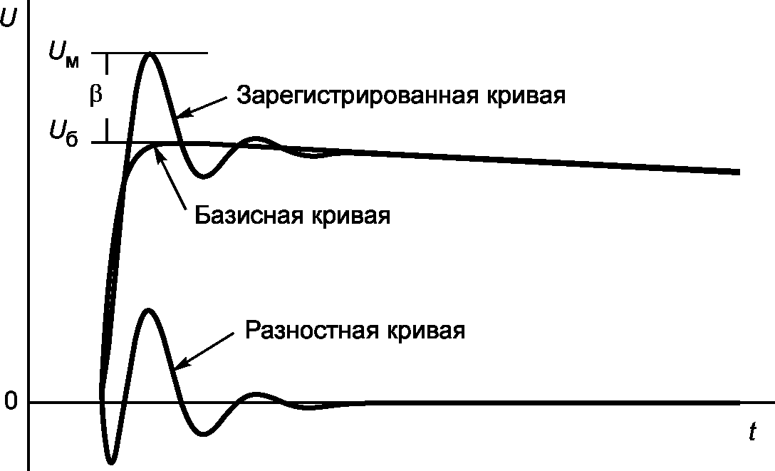 8) для получения разностной кривой R(t) = U0(t) - Uб(t) из зарегистрированной кривой с компенсированным сдвигом U0(t) вычитается градуированная коэффициентом E базисная кривая Uб(t);