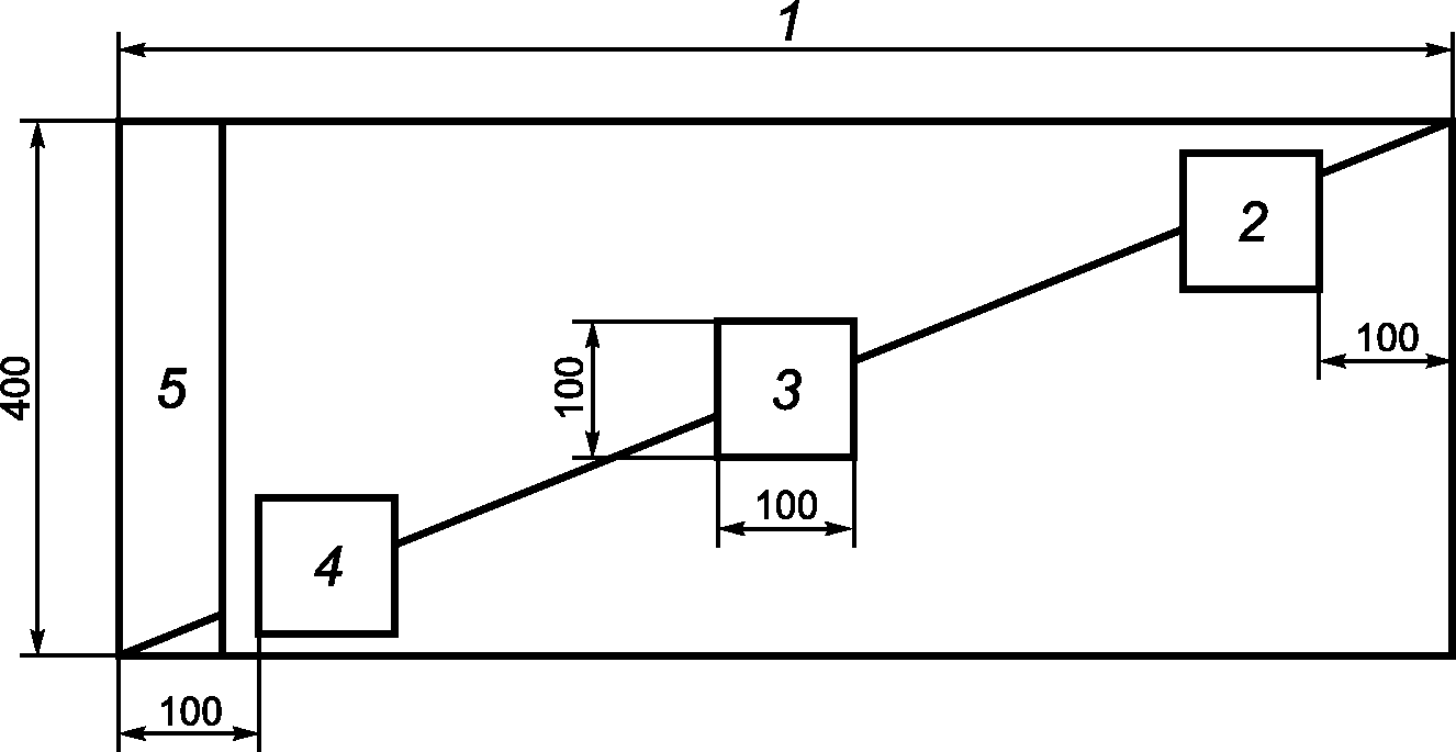 8.3.2 Для определения массы материала на единицу площади от отобранного рулона по всей ширине полотна отрезают полосу материала длиной не менее 0,4 м. Из полосы материала вырубают три круглых или квадратных образца площадью (10000 +/- 100) мм2 каждый. Образцы вырубают так, чтобы один из них был посередине полосы, а два других расположены симметрично относительно первого вдоль линии, соединяющей по диагонали два противоположных угла полосы, при этом расстояние между внешним краем образца и краем полотна должно быть примерно 100 мм. Не допускается вырубать образцы на участке кромки. Схема вырубки квадратных образцов представлена на рисунке 1.