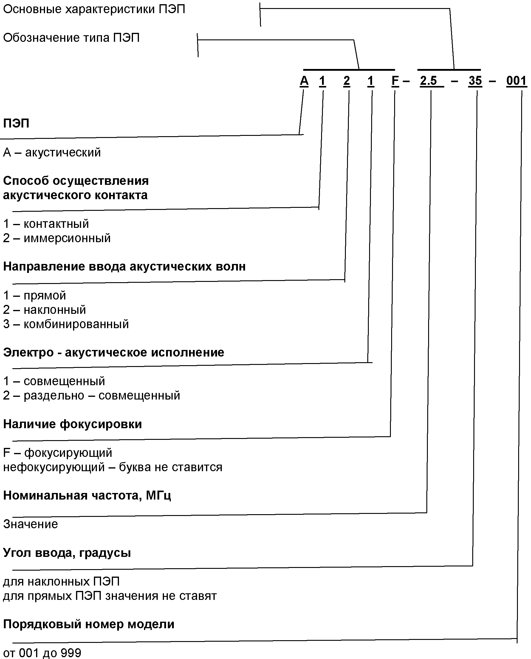 Пример условного обозначения ультразвукового ПЭП, контактного, наклонного, совмещенного, фокусирующего, номинальной частотой 2,5 МГц, углом ввода 35°, порядковым номером модели 001: