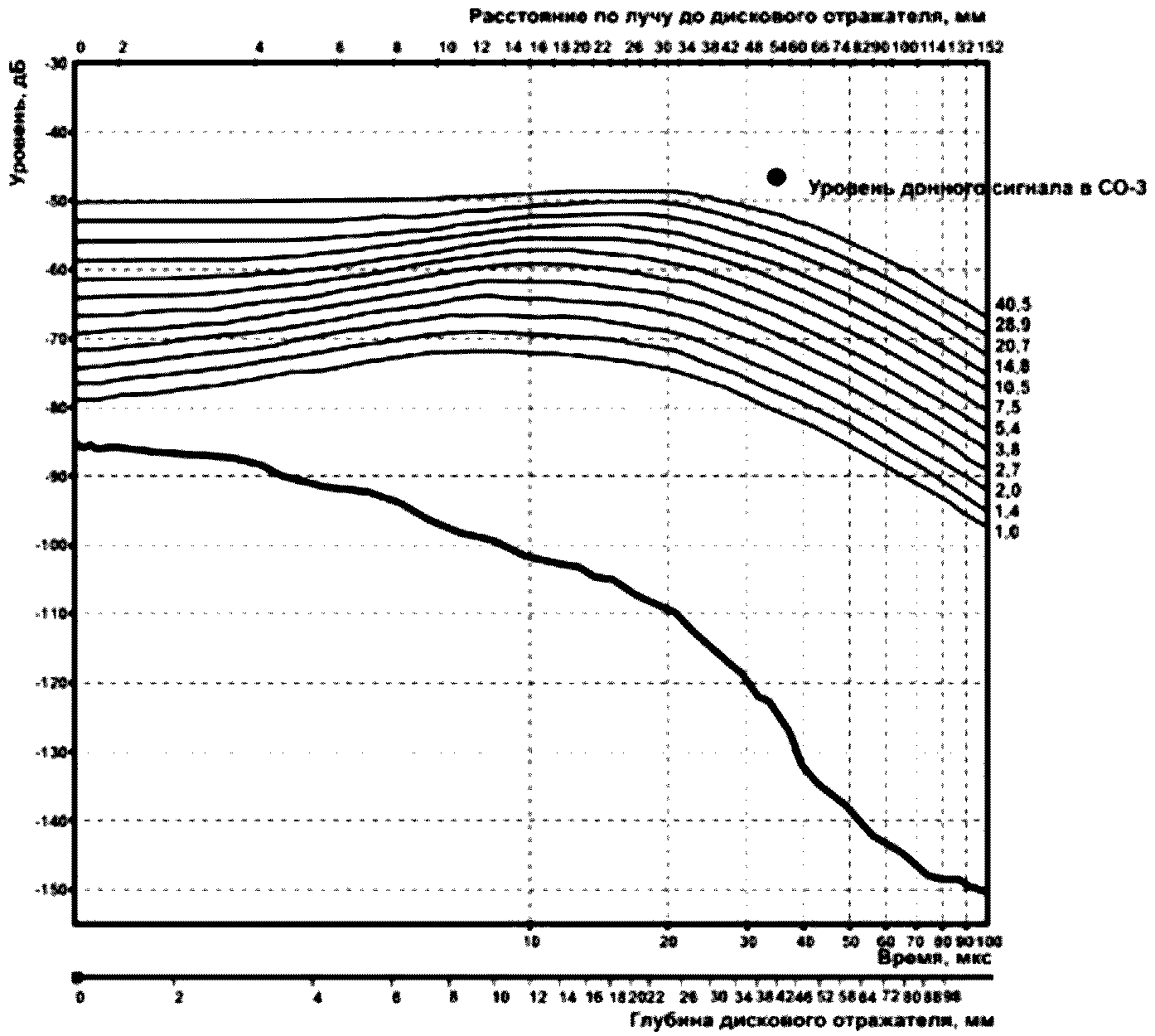 За уровень 0 дБ принята амплитуда импульса возбуждения преобразователя (20 В). Разметка времени по горизонтальной оси соответствует распространению сигнала только в материале объекта контроля. Справа от кривых АВД указана площадь соответствующего дискового отражателя в квадратных миллиметрах. |