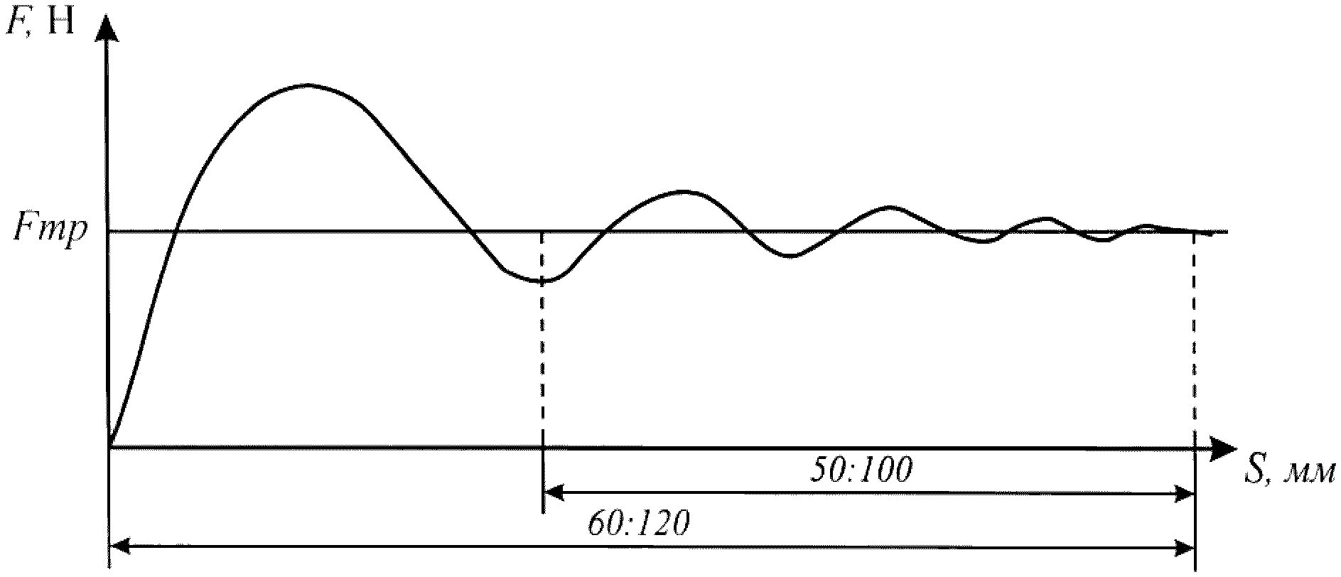 7.2.2.7. Включают разрывную машину, устанавливают скорость передвижения рабочего эталона подошвы обуви или рабочего эталона подошвы ноги человека, равную 500 мм/мин, и на регистрирующем приборе разрывной машины получают график зависимости силы от перемещения. Вид зависимости приведен на рисунке 4. Длина пути скольжения рабочего эталона подошвы обуви или рабочего эталона подошвы ноги человека должна составлять 60 - 120 мм.