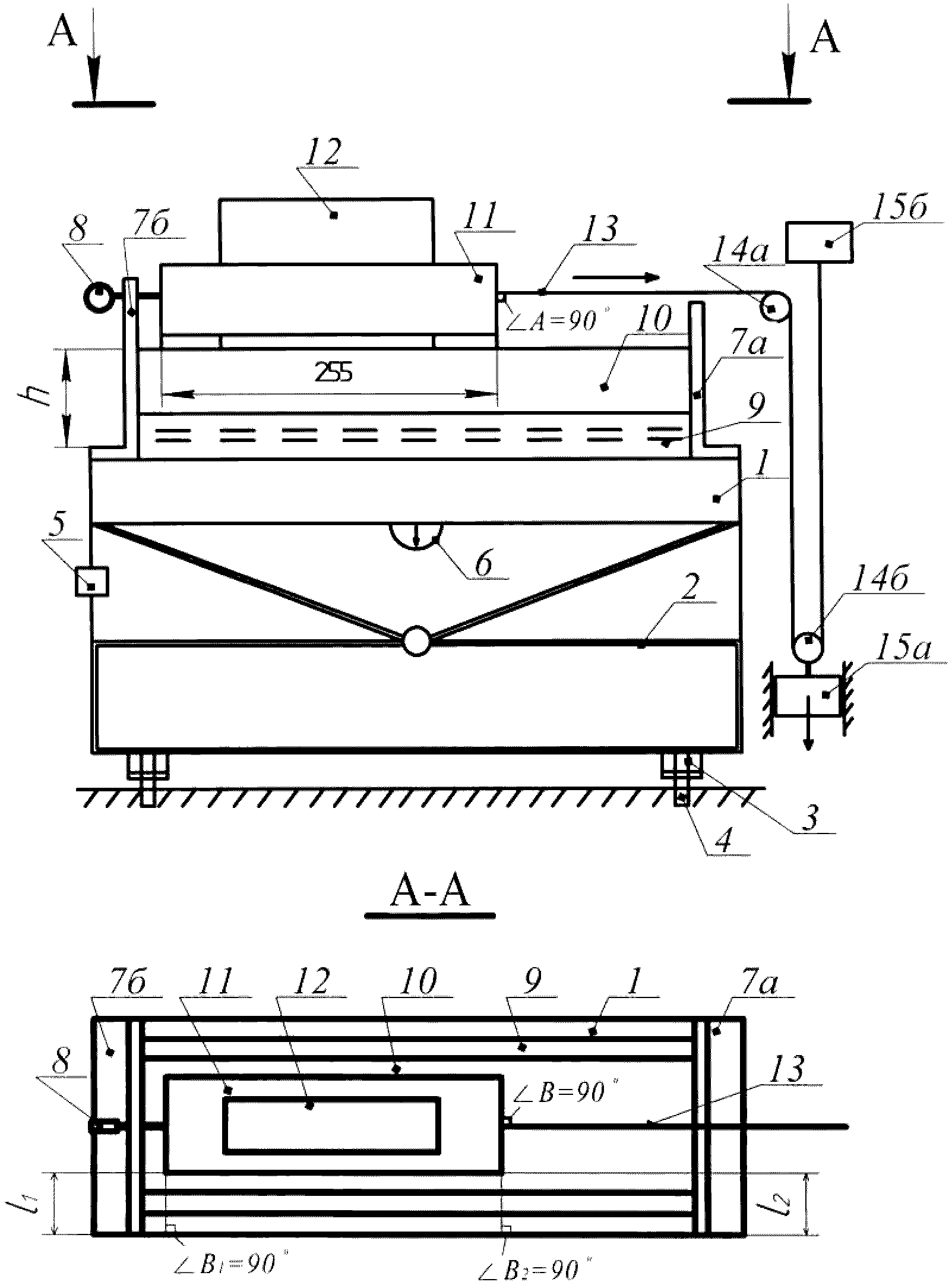 2, что соответствует удельному давлению от человека массой 75 кг. К передвижной грузовой платформе закреплен трос 13, который через систему блоков 14а и 14б подсоединен к измерительной части разрывной машины 15а и 15б. Блок 14а располагается на подвижной нижней части разрывной машины 15а, а блок 14б на верхней измерительной части разрывной машины 15б. Трос 13 в процессе испытаний должен быть горизонтален и перпендикулярен к передвижной грузовой платформе 11, что достигается размещением между образцом исследуемого покрытия пола 10 и двухконсольной платформой 1 листа фанеры 9 необходимой толщины, зависящей от толщины образца исследуемого покрытия пола, и соответствующим размещением передвижной грузовой платформы на поверхности образца покрытия пола.
