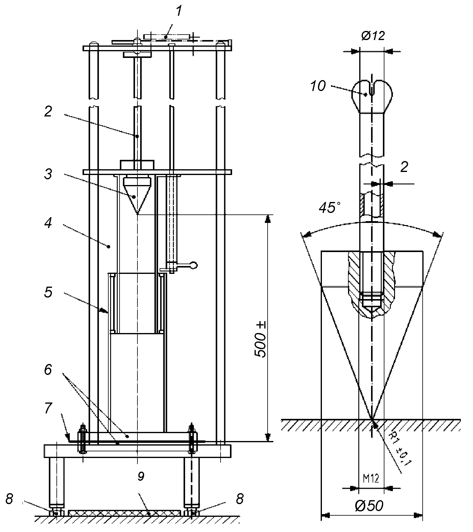 9.3. Испытательный конус устанавливается на заданной высоте, равной (500 +/- 2) мм.