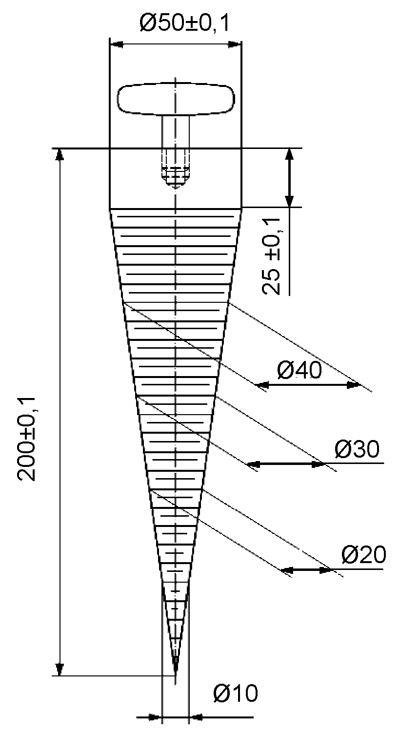 рисунке 3, и массой (600 +/- 5) г, включая рукоятку. Шкала измерительного конуса должна обеспечивать возможность измерения отверстий диаметром до 50 мм с ценой деления 1 мм и быть изготовлена в виде штрихов с шагом 3,5 мм по высоте (оси) конуса. Размеры штрихов должны соответствовать требованиям