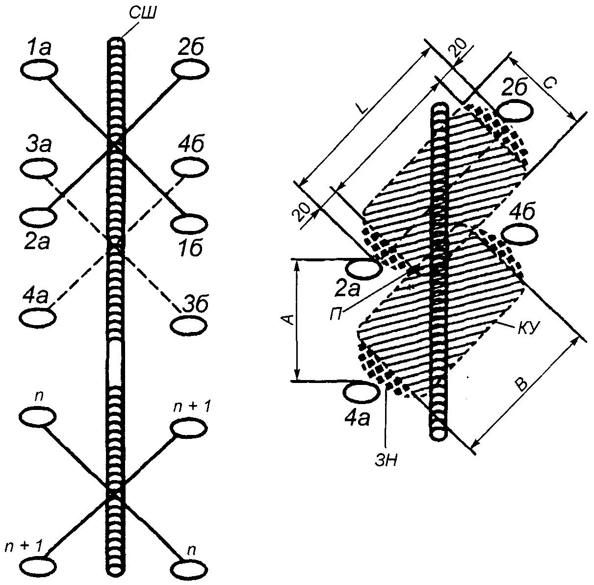 Для выявления разноориентированных дефектов применяют также другой способ, при котором каждый контролируемый участок проверяют дважды, намагничивая его в двух направлениях. К проверке последующего участка приступают после контроля предыдущего. Схема установки электроконтактов, расположение КУ, их размеры при таком способе показаны на рисунке К.6. Первый участок проверяют в таком порядке: устанавливают электроконтакты в положение 1а - 1б, намагничивают, наносят суспензию, КУ осматривают с целью обнаружения дефектов. Затем электроконтакты устанавливают в положение 2а - 2б, намагничивают, наносят суспензию и снова осматривают. Аналогично проверяют другие участки сварного шва.