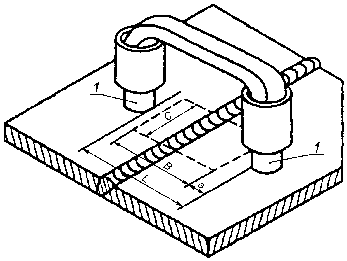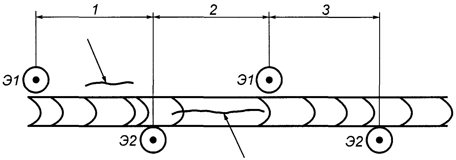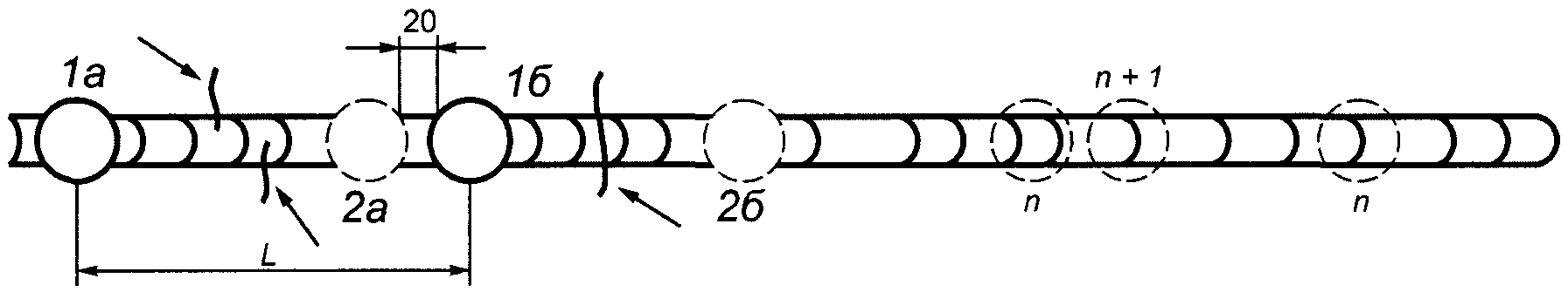 Контроль протяженного сварного шва с применением электромагнита, питаемого постоянным или выпрямленным током, для обнаружения поперечных трещин проводят способом приложенного магнитного поля по участкам (рисунок К.9). Электромагнит переставляют по сварному шву без чередования полюсов. Для обеспечения перекрытия соседних участков расстояние между местами установки полюсов 2а - 1б должно быть не менее 20 мм.