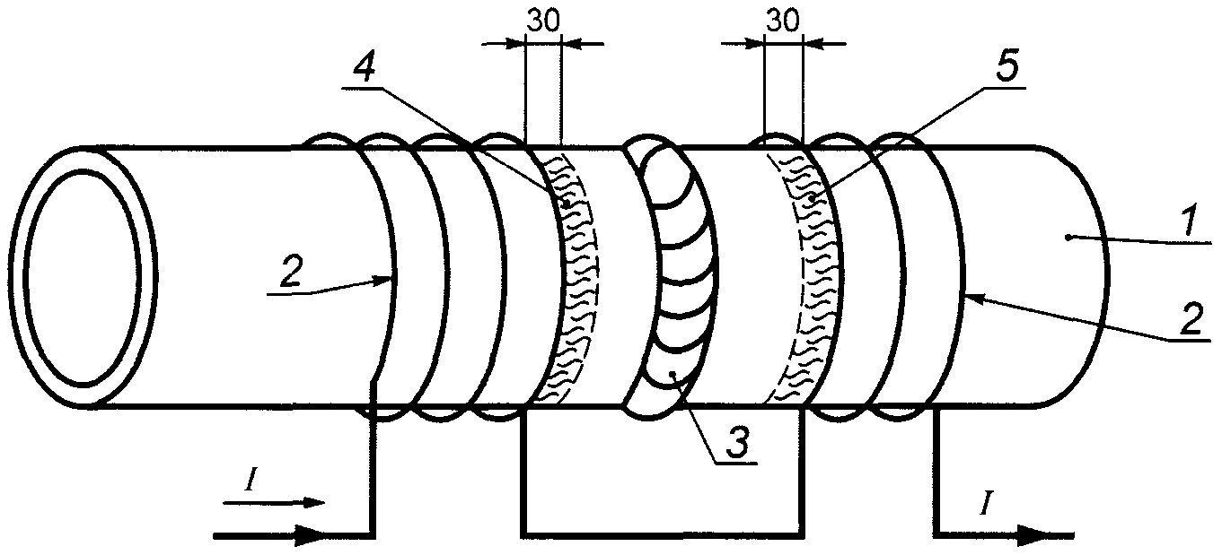Для контроля стыкового сварного шва на трубчатой конструкции кабель наматывают по обе стороны от шва (рисунок К.11). Для намагничивания зоны контроля рекомендуется обеспечивать примерно 10000 - 12000 ампер-витков при контроле СОН и 8000 - 10000 ампер-витков при контроле СПП. Зоны 4 и 5, примыкающие к виткам соленоида, являются зонами невыявляемости дефектов. При таком способе намагничивания на сварном шве выявляются продольные трещины.