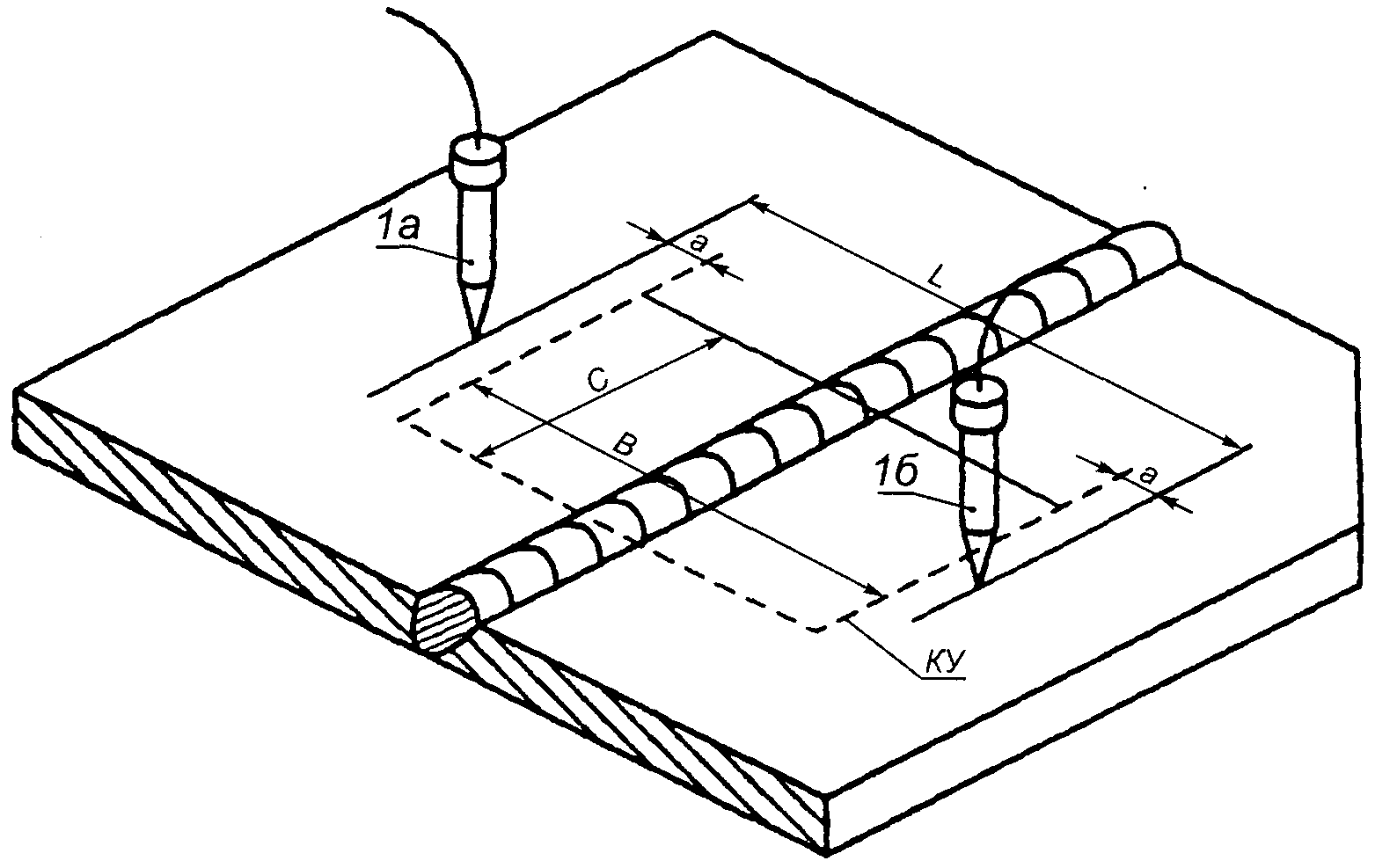 Контроль сварного соединения внахлестку проводят по участкам. Сварной шов и околошовные зоны предварительно размечают на участки. На рисунке К.5 показано положение электроконтактов на трех участках. Сначала проверяют первый КУ. Для этого электроконтакты устанавливают в положение 1а - 1б, пропускают ток, наносят суспензию и осматривают этот КУ. Затем проводят контроль второго КУ. Для этого устанавливают электроконтакты в положение 2а - 2б, пропускают ток, наносят суспензию и осматривают КУ. После этого в аналогичном порядке проверяют третий и другие КУ.
