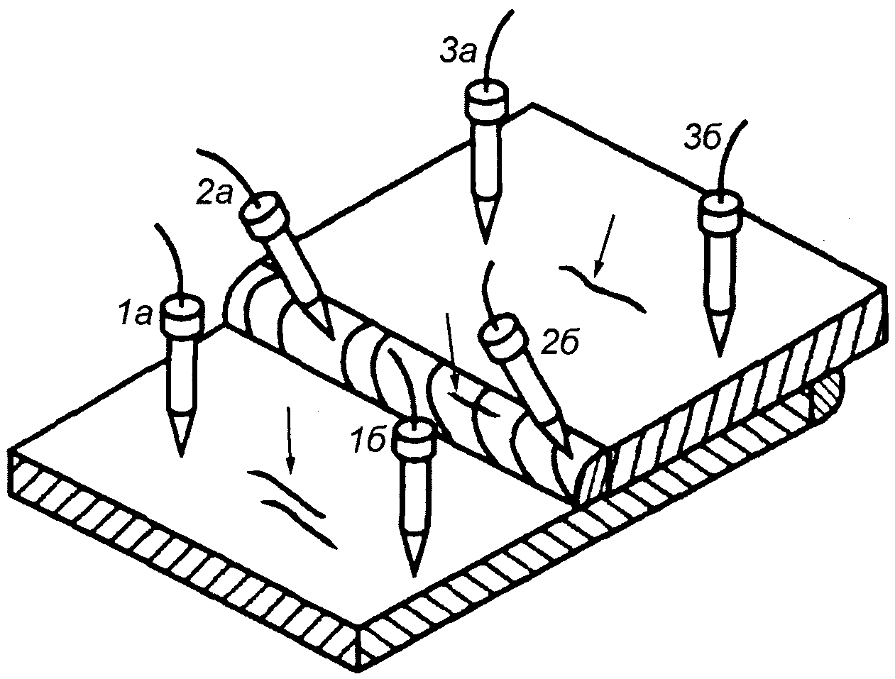 Аналогично проверяют другие контролируемые участки, устанавливая электромагнит полюсными наконечниками в положение 2а - 2б, 3а - 3б.
