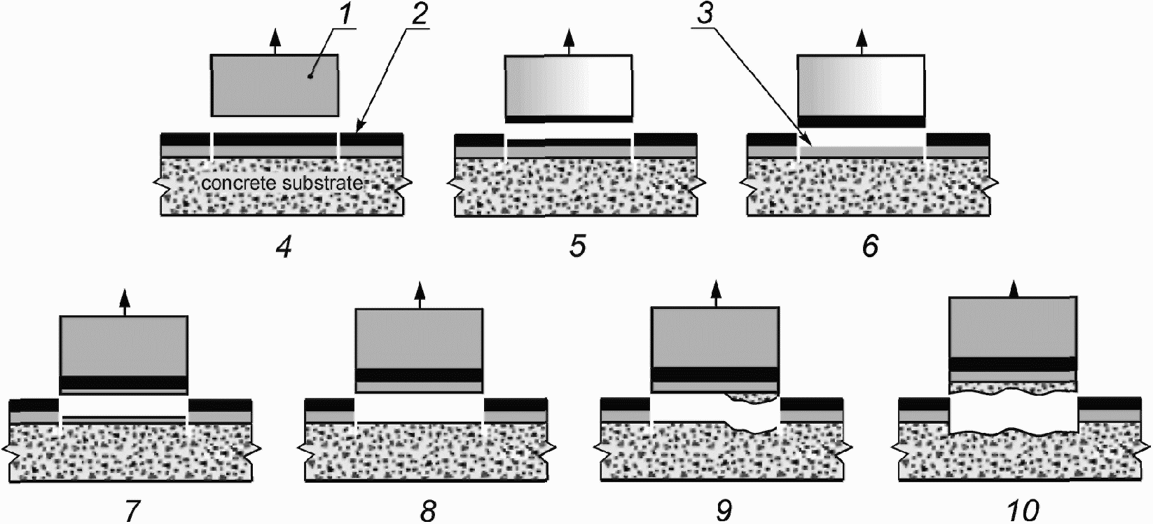 12.2 Трактовка результатов. Адгезия слоистого ПАВ к бетонной поверхности необходима, чтобы бетонные элементы могли передать силу ПАВ. Сцепление стыка и прочность (качество) самого бетона являются важными факторами. Возможные типы отрыва в настоящем испытании на отрыв приведены на