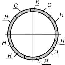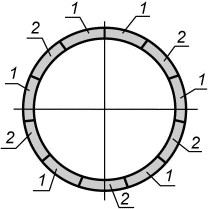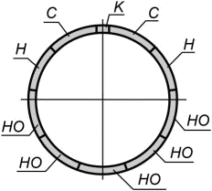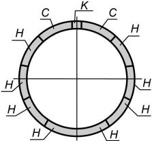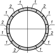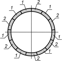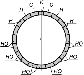 5.7 Тюбинговые кольца должны собираться из тюбингов в зависимости от горнотехнических условий: площади поперечного сечения выработки, ее назначения, горного давления, обводненности. Расположение тюбингов в кольце в зависимости от этих условий показано в