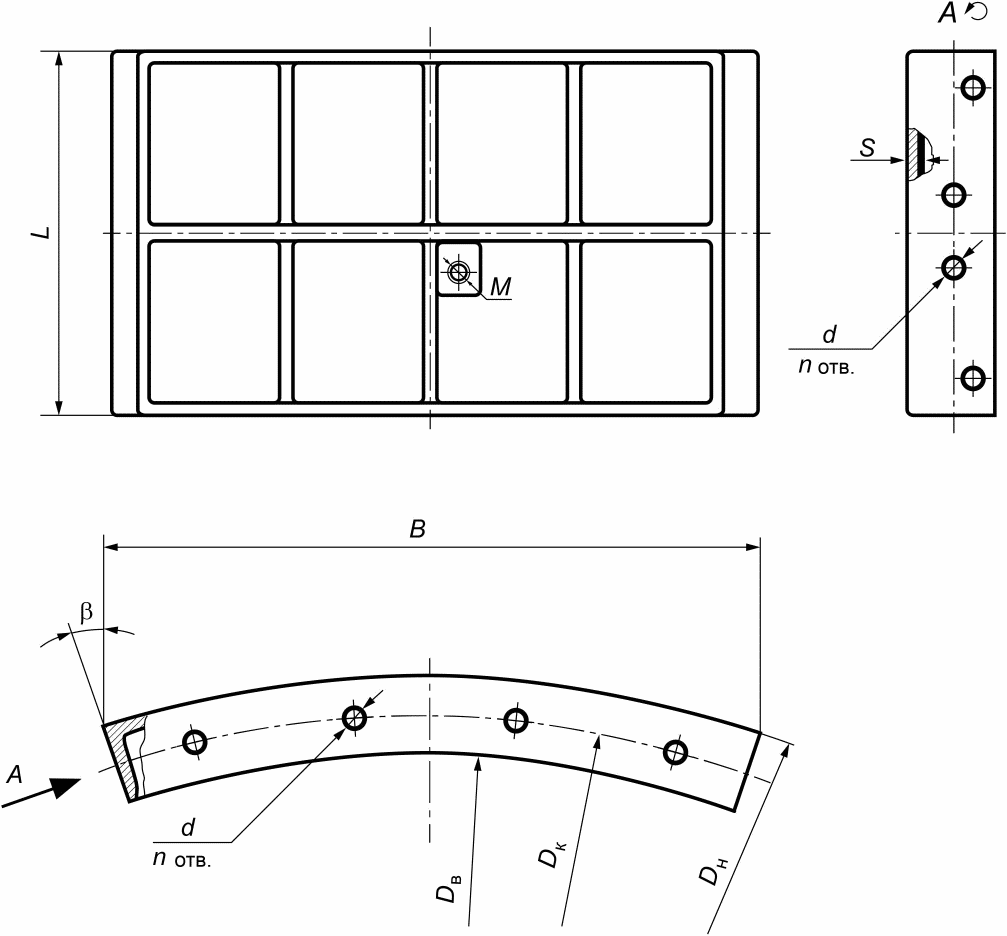 L - ширина тюбинга, мм; B - длина тюбинга по внешней хорде,