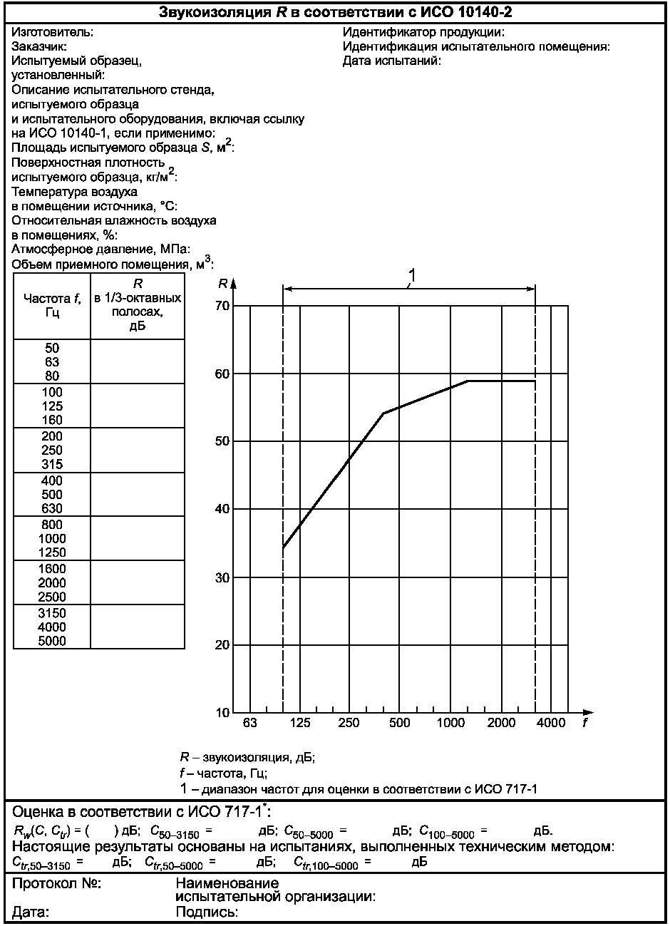 рисунке B.1 приведен пример формы для представления результатов лабораторных измерений звукоизоляции воздушного шума элементов зданий. Аналогичную форму следует применять для приведенной разности уровней элемента или улучшения звукоизоляции за счет применения облицовок.