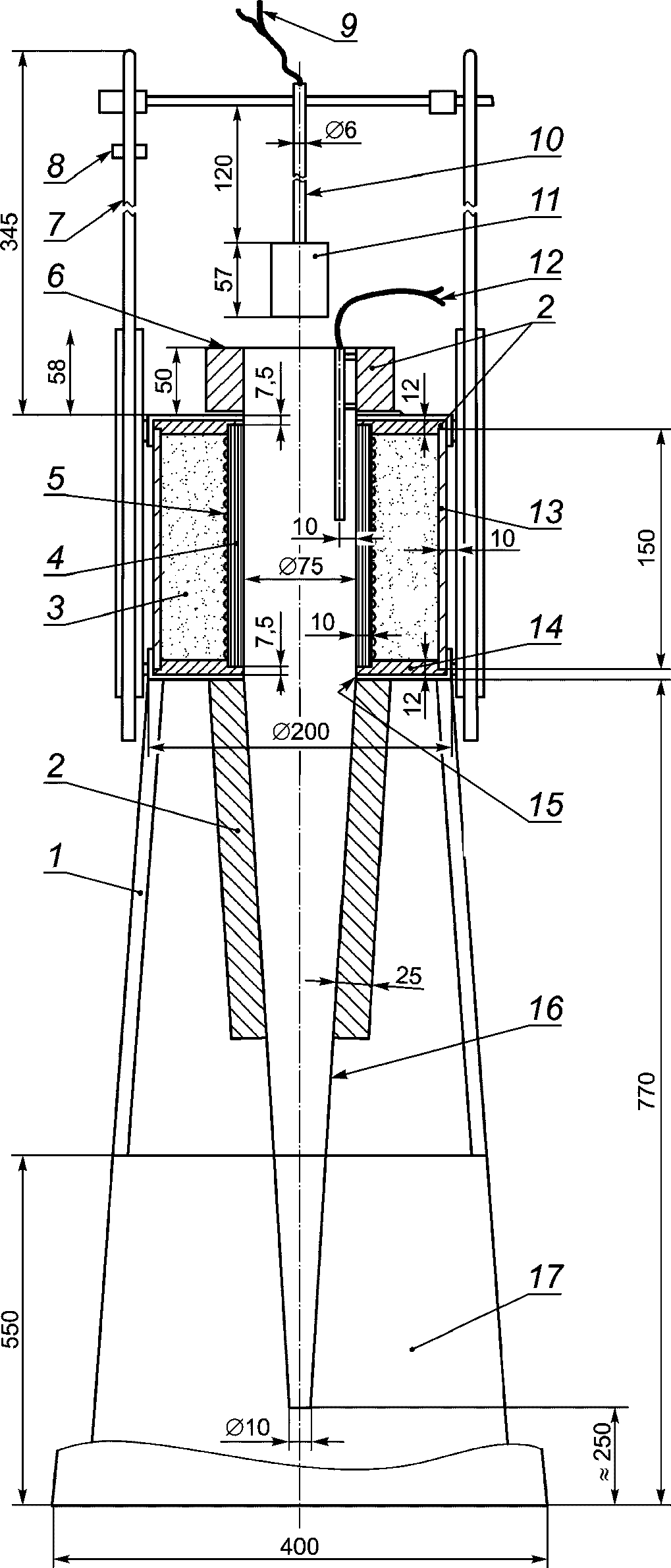 4.2.3. К нижней части печи прикрепляют сквозной конусообразный стабилизатор воздушного потока длиной 500 мм с равномерно уменьшающимся внутренним диаметром от (75 +/- 1) мм на верхней части до (10 +/- 1) мм на нижней.