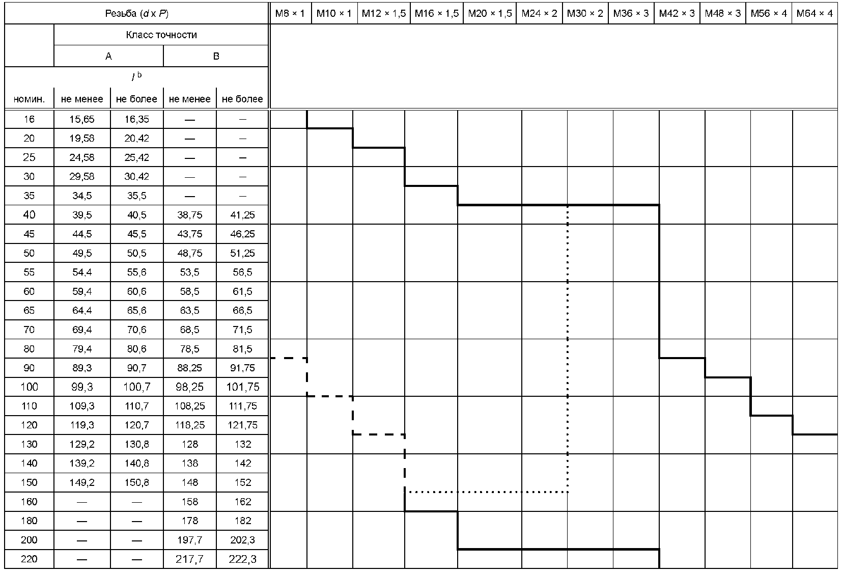 Настоящий стандарт устанавливает характеристики винтов с шестигранной головкой с мелким шагом резьбы с номинальным диаметром резьбы, d, от 8 до 64 мм, класса точности A для номинальных диаметров резьбы, d, от 8 до 24 мм и номинальной длины l, свыше и включительно 10d или 150 мм, выбирая меньшее значение, и класса точности B для номинальных диаметров резьбы, d, более 24 мм или номинальной длиной l, более 10d или 150 мм, выбирая меньшее значение.