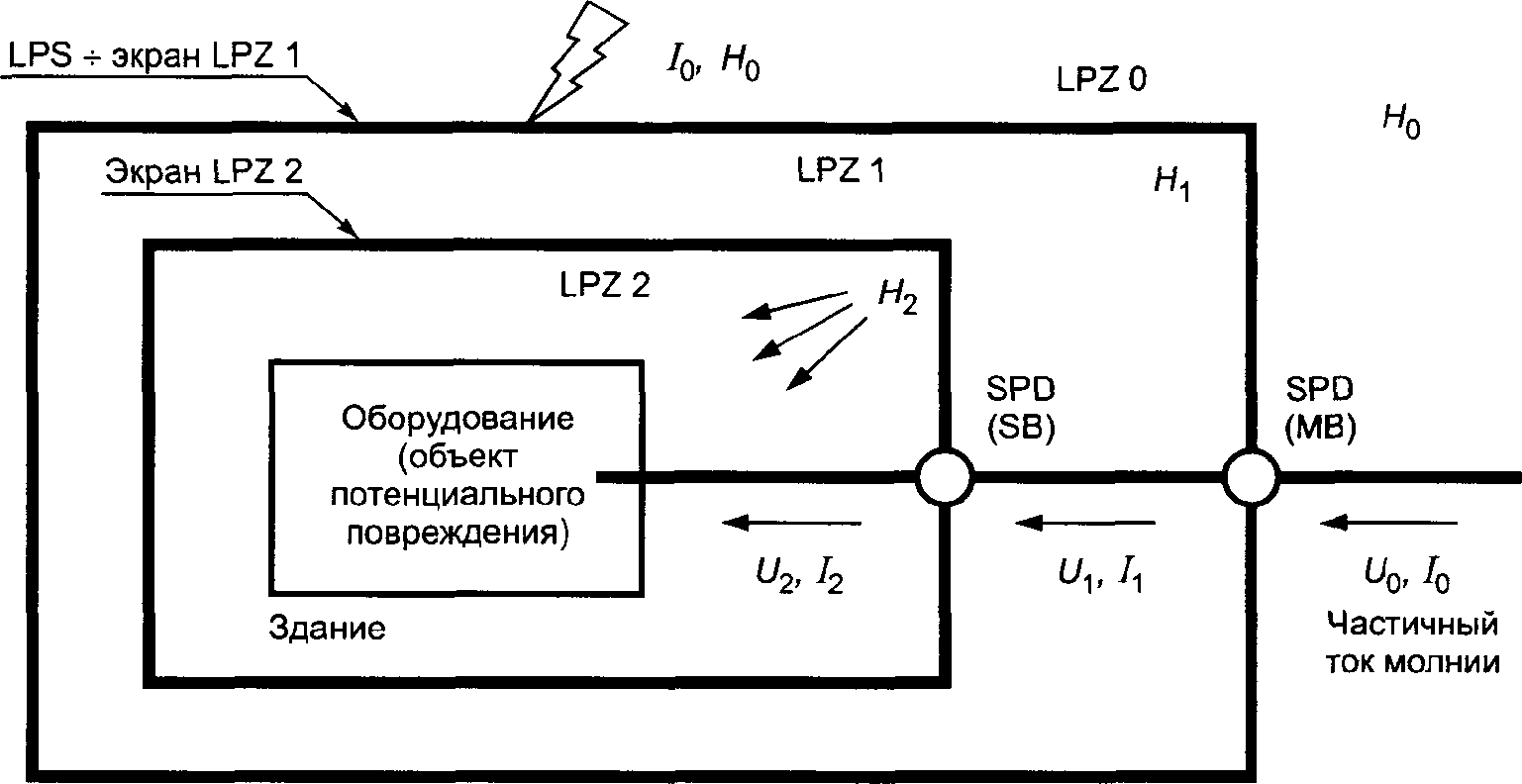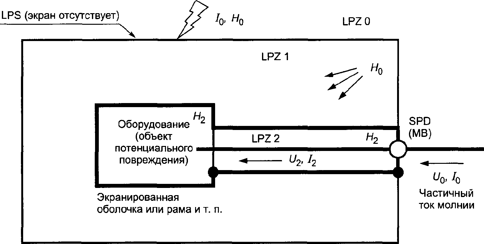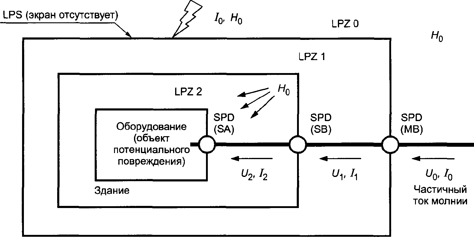 - протеканием частичных токов молнии по проводникам (например, по проводникам токоотводов системы внешней защиты от молнии LPS в соответствии с МЭК 62305-3 или по внешнему пространственному экрану в соответствии с данным стандартом).