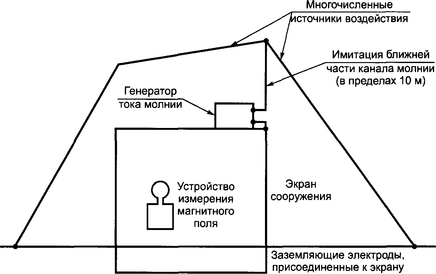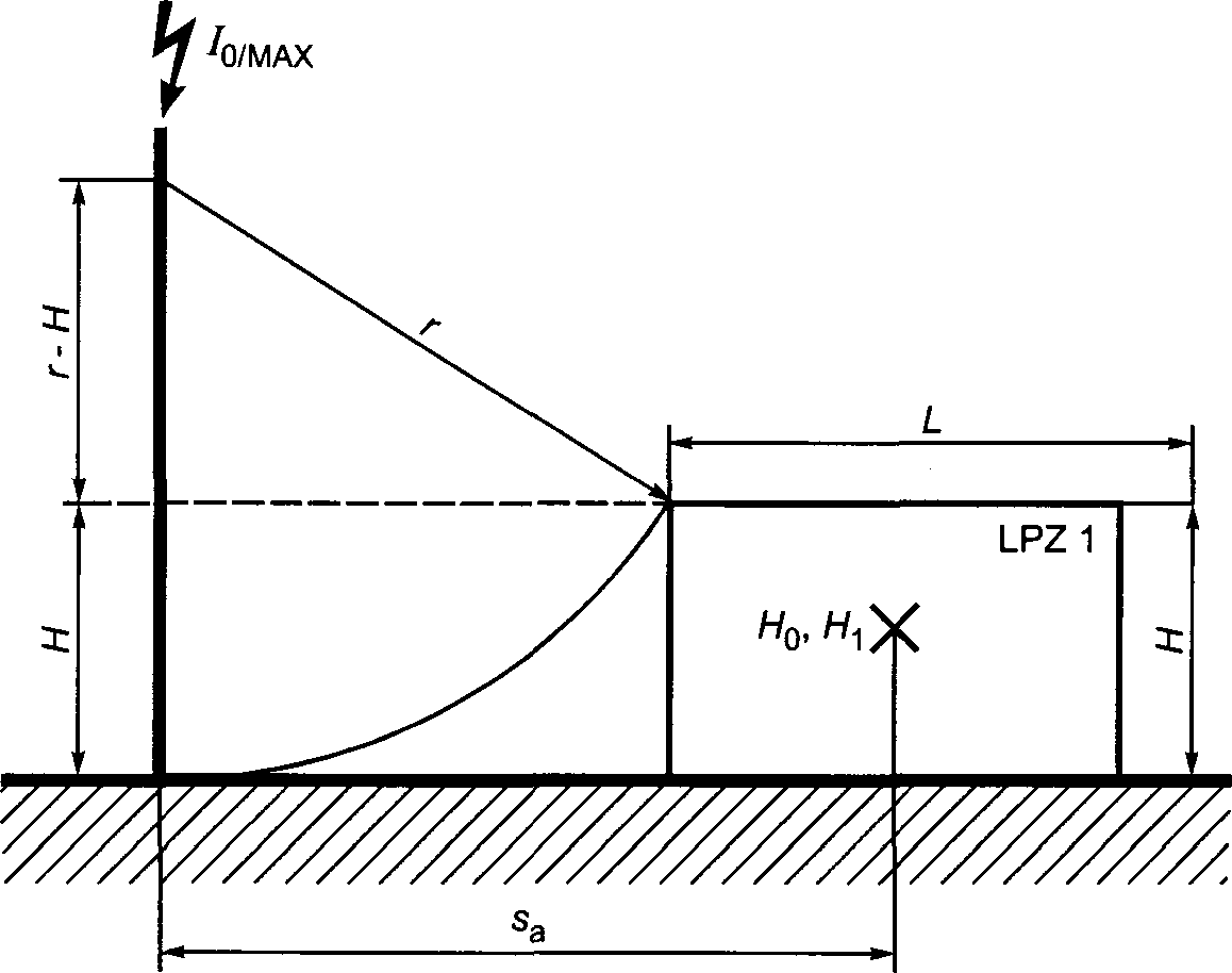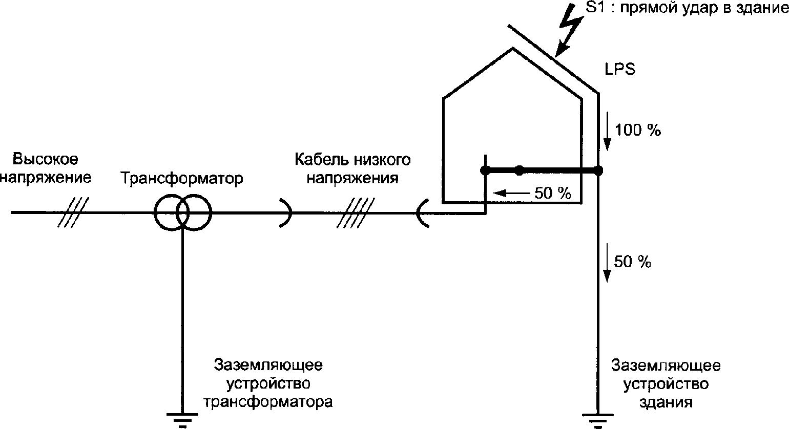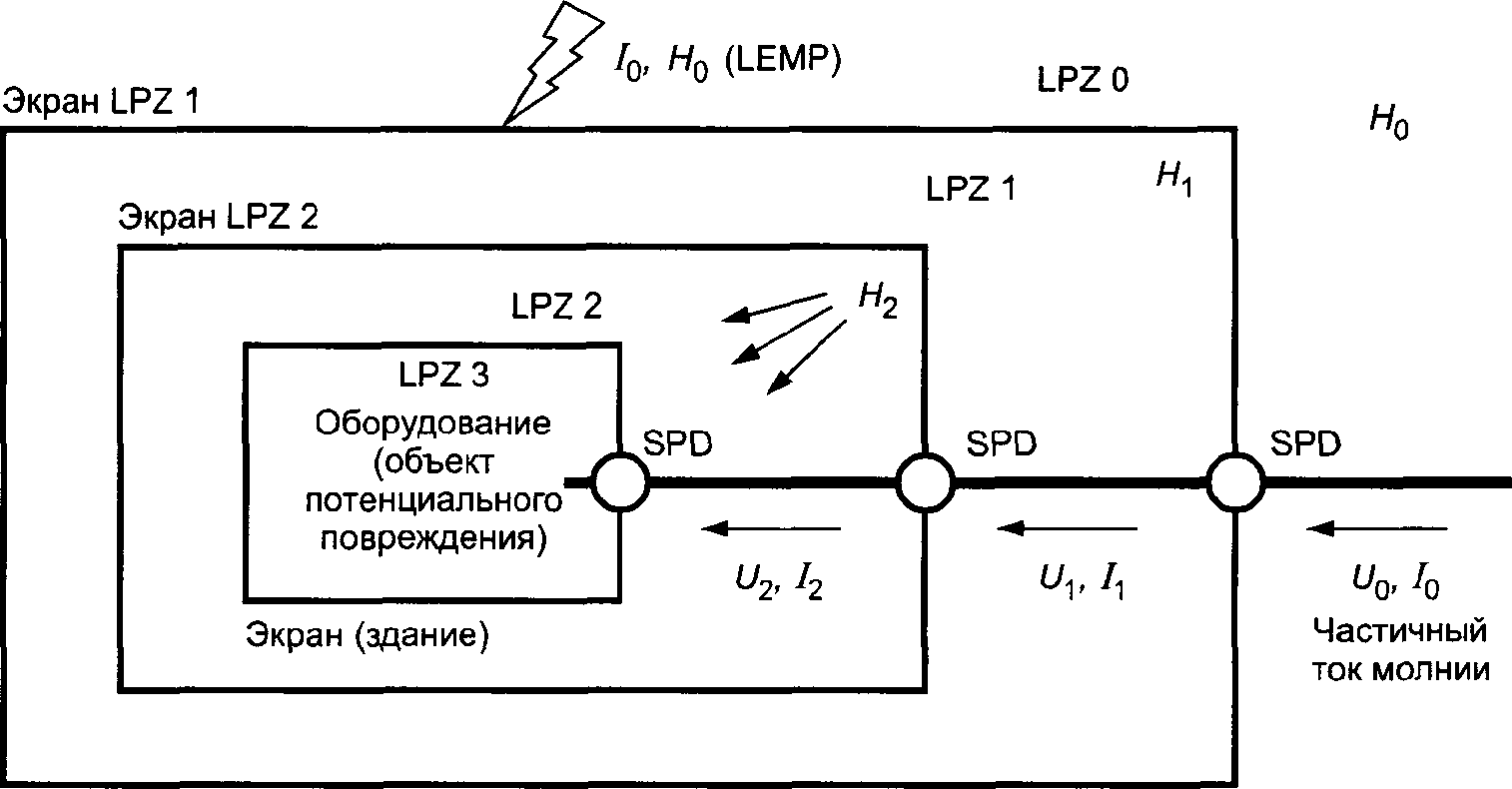 - протеканием частичных токов молнии по проводникам (например, по проводникам токоотводов системы внешней защиты от молнии LPS в соответствии с МЭК 62305-3 или по внешнему пространственному экрану в соответствии с данным стандартом).