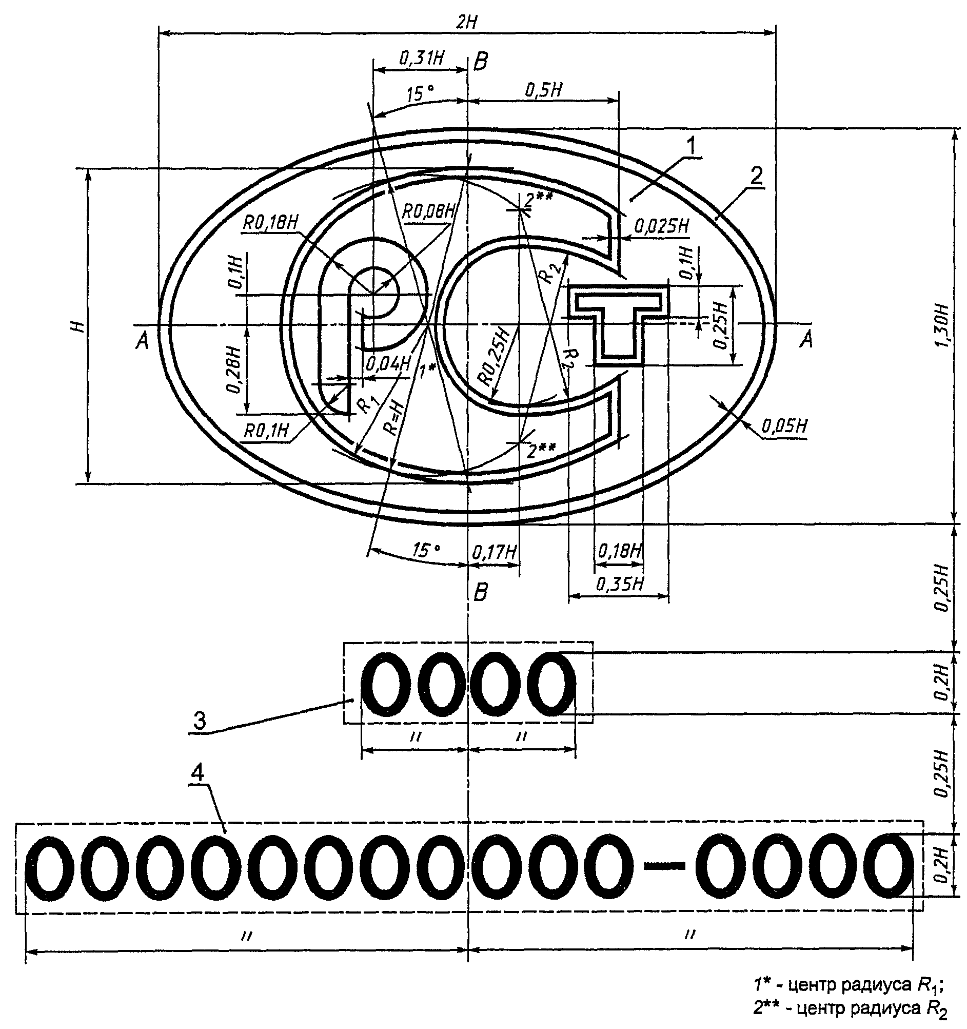 рисунку Б.1 (Приложение Б), симметрично относительно вертикальной оси ВВ знака, шрифтом, приведенным на
