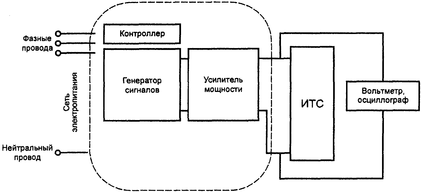 Схема оборудования для испытаний ТС на устойчивость к изменениям частоты питающего напряжения с использованием ИГ, состоящего из генератора сигналов и усилителя мощности приведена на рисунке 3.