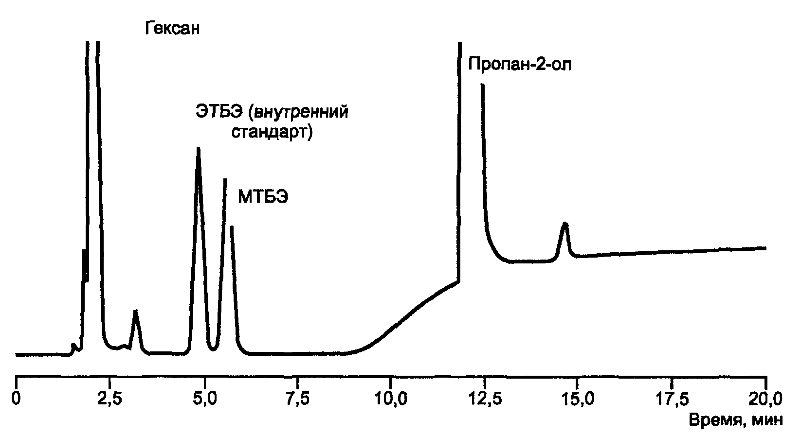 8.2, может содержать и другие полярные компоненты, присутствие которых загрязняет легкие дистилляты (НД) и пики которых могут наложиться на пики МТБЭ и ЭТБЭ. Однако структурный анализ образцов НД из широко распространенных источников показал отсутствие этой проблемы. Рекомендуется при анализе НД неизвестного состава провести анализ концентрата, полученного в результате десорбции МТБЭ, до введения внутреннего стандарта. Условия анализа те же, что и при анализе НД на содержание МТБЭ. При обнаружении компонента, совпадающего по времени удерживания с ЭТБЭ, необходимо определить его площадь и при расчете пика ЭТБЭ вычесть наложившийся компонент.
