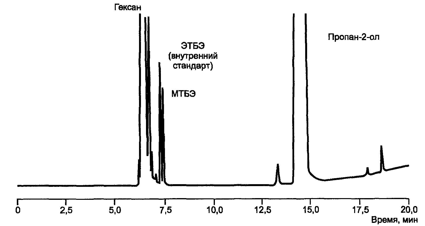 8.3.4. После выхода пиков МТБЭ/ЭТБЭ, для выхода изопропанола (метанола), повышают температуру в колонке до 130 °С. По завершении цикла дают колонке остыть для проведения следующего испытания.