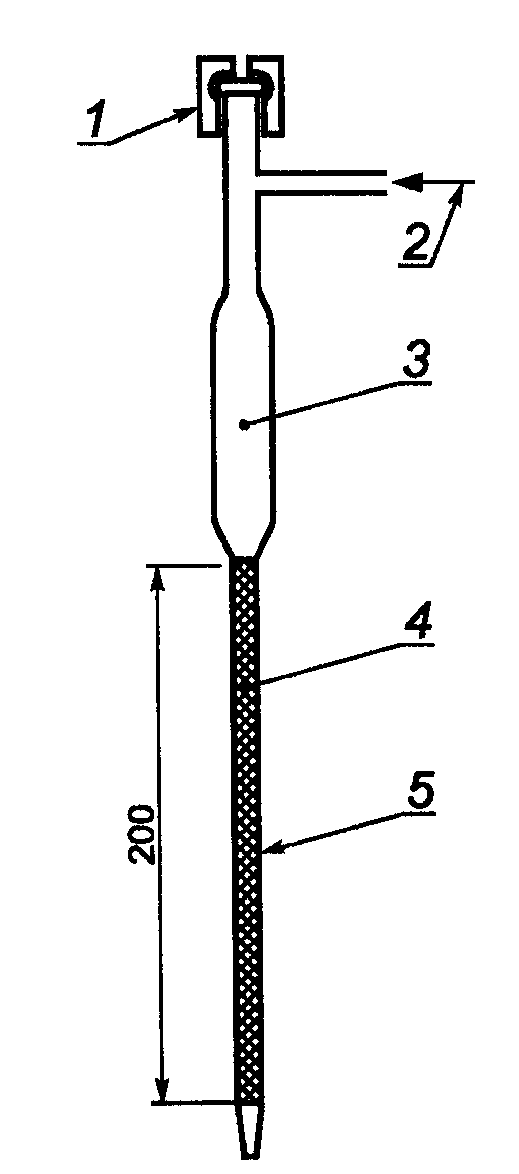 Адсорбционная колонка может быть изготовлена из пирексной трубки длиной 200 мм, наружным диаметром 7 мм и внутренним диаметром 4 мм, в верхней части которой расположен резервуар, способный вместить 25 см3 образца. Над резервуаром имеется боковой отвод, к которому подводят сжатый воздух для создания давления в колонке. Над боковым отводом расположено быстросъемное резьбовое соединение, позволяющее навинчивать колпачок с мембранным уплотнителем, который дает возможность быстро сбрасывать давление воздуха.