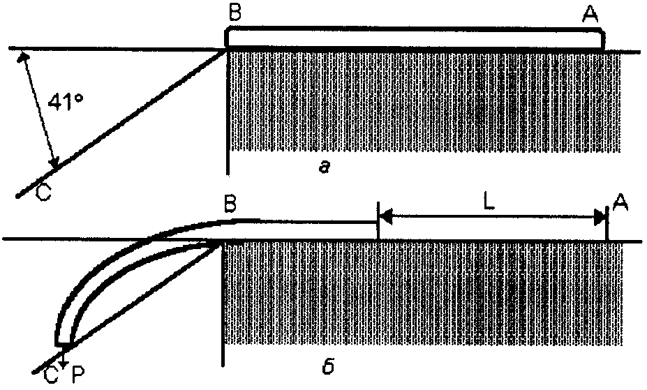 Образец медленно перемещают в направлении точки B до тех пор, пока его край не достигнет прямой BC (рисунок 5, б), образующей с прямой AB угол (41 +/- 1)°.