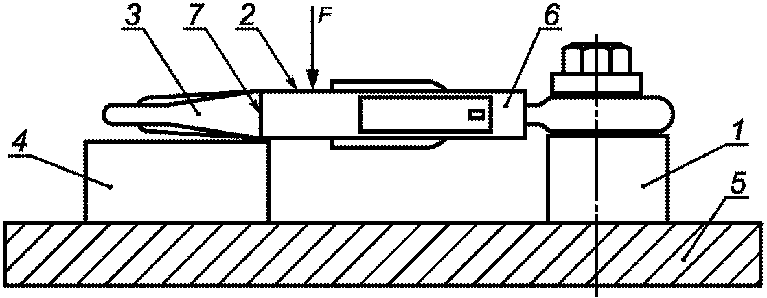 рисунок 7) прикладывают указанное усилие в течение (60 +/- 1) с к запорному элементу в точке, наиболее близкой к носовой части, насколько это возможно. Скорость изменения нагрузки - от 50 до 150 Н/с.
